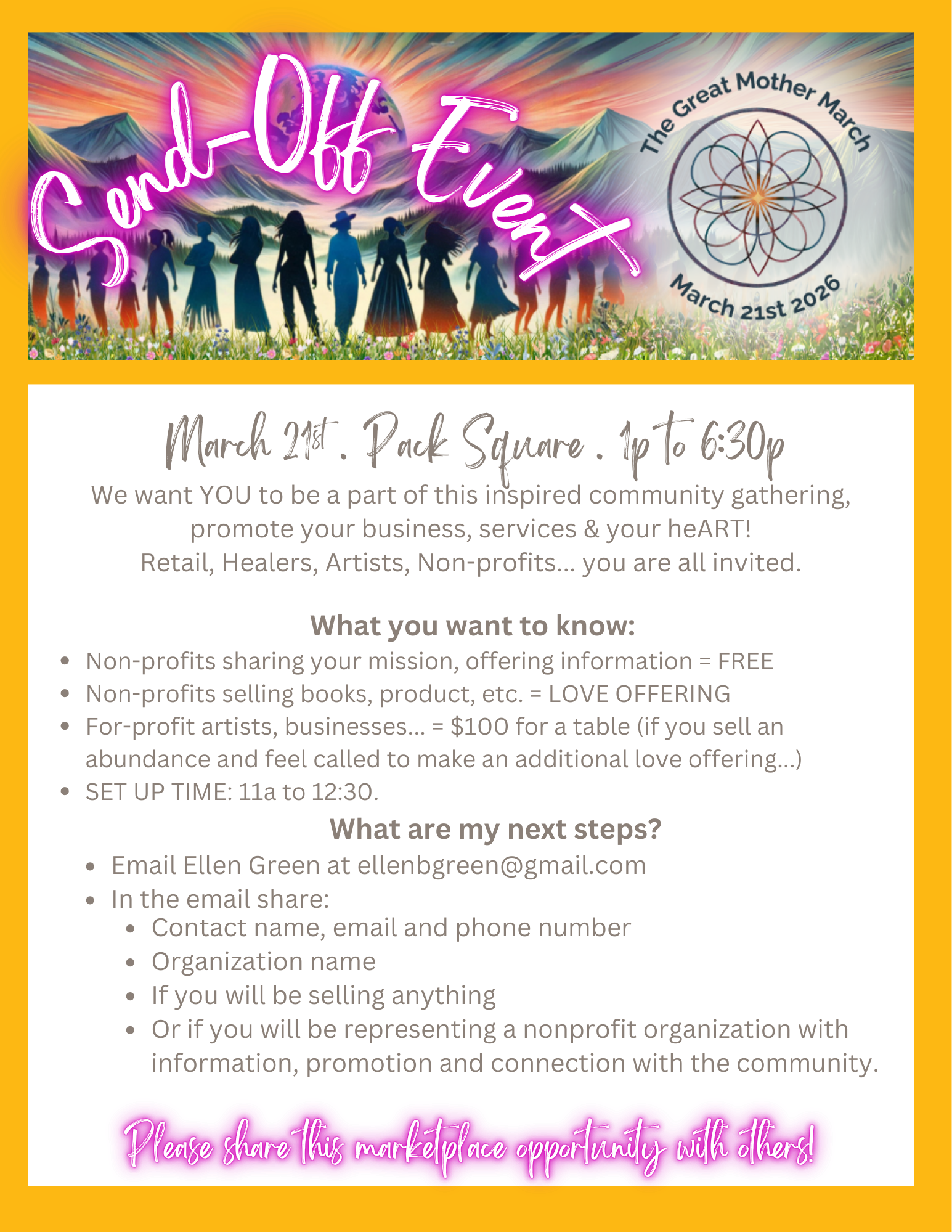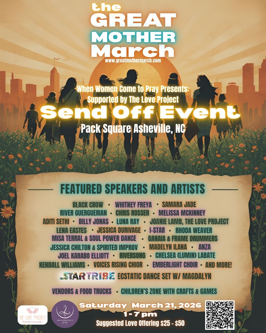 We invite you to a special Great Mother March Send Off Event on Saturday March 21st from 1:00 - 7:00pm at Pack Square Park in Asheville, North Carolina.