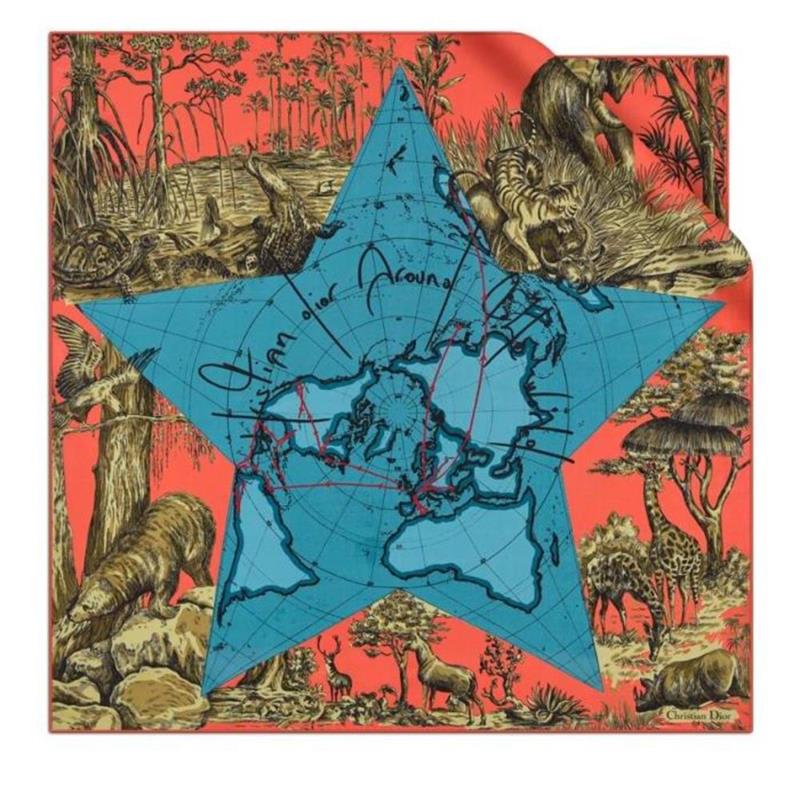 The Dior Around the World square scarf is part of the collaboration with the Italian artist Pietro Ruffo and depicts two hallmark House inspirations: Toile de Jouy and Christian Dior's lucky star.