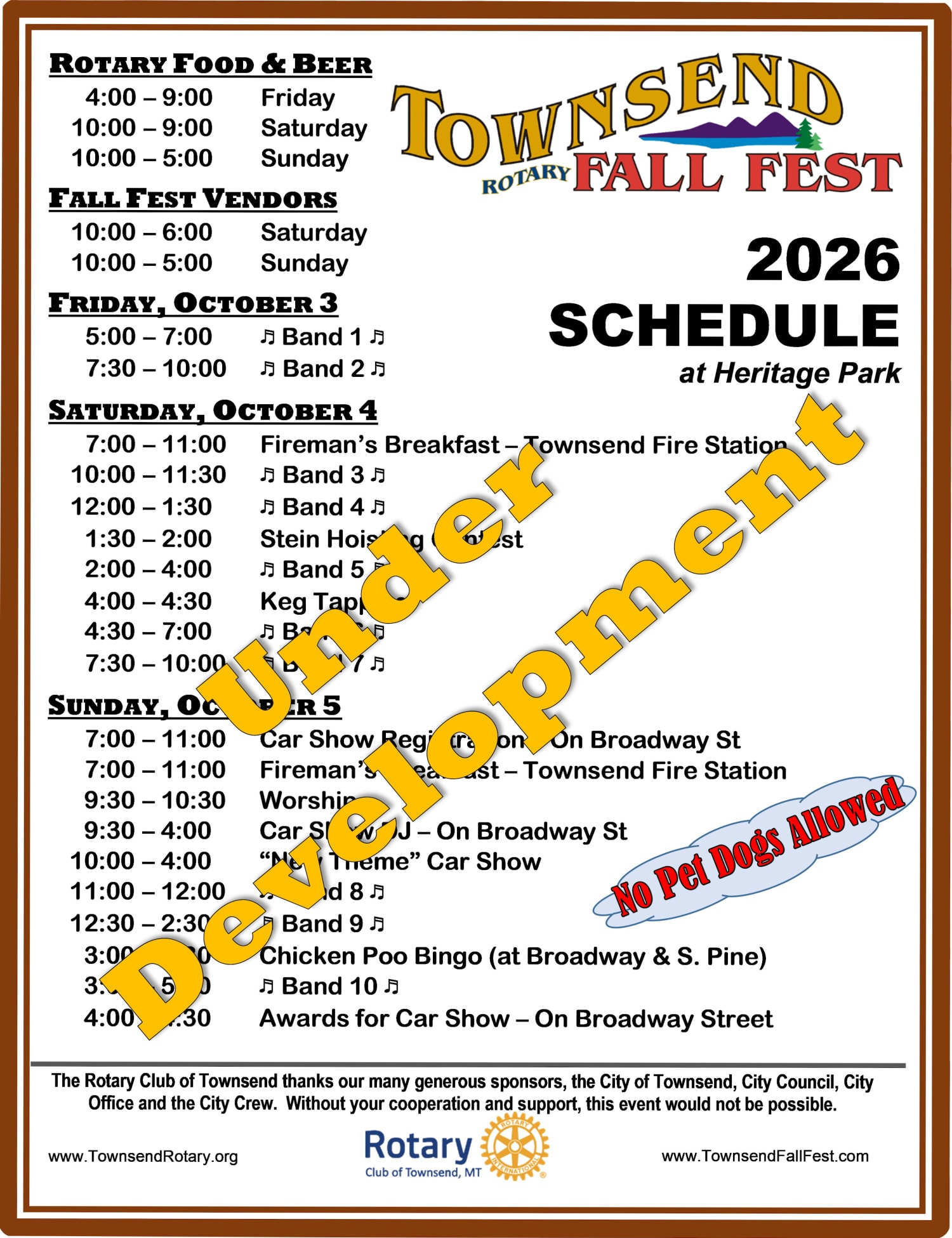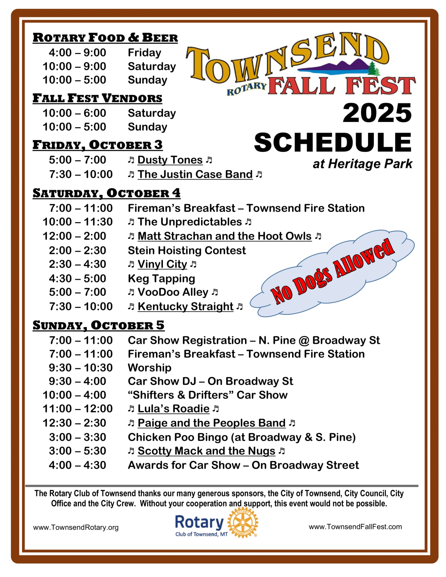 The Townsend Rotary Fall Fest is not just a single 3-day event: Townsend Rotary Fall Fest is a collection of events spread out over 3 days. Our Fall Fest features great vendors selling outstanding food and products and of course we have an incredible schedule of musical entertainment over the 3 days of Fall Fest. In addition to the vendors and entertainers, Fall Fest also features one of Montana's largest car shows.