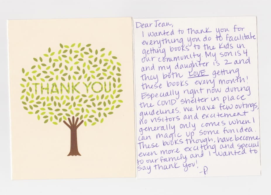 We frequently receive calls and letters telling us how much parents appreciate the wonderful books their children receive. Here is one about how the books help to amuse children as they shelter at home.