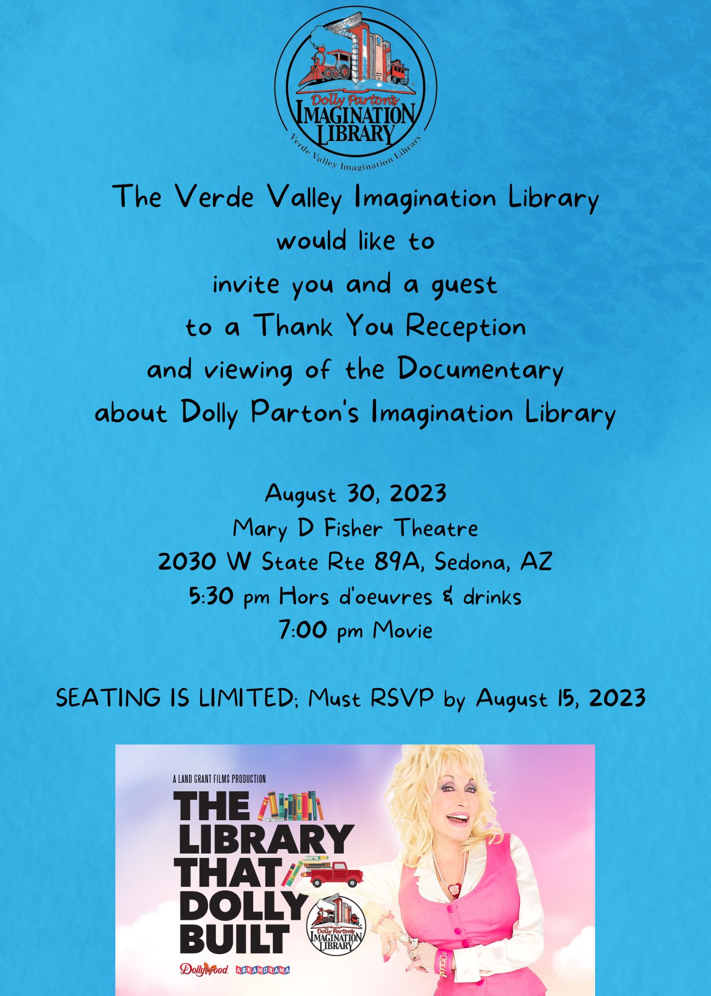 We would like to invite you and a guest to a Thank You Reception and viewing of The Library that Dolly Built documentary. We want to thank all of the wonderful community members and volunteers who make the Verde Valley Imagination Library possible and inspire a love of reading in the Verde Valley and Sedona.