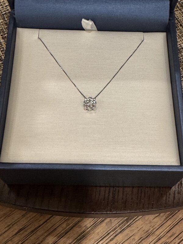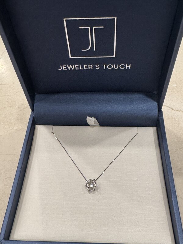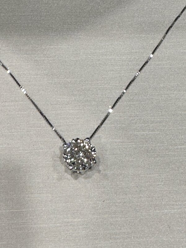 Simple elegance! This necklace is a 14k white gold 'Lovebright' cluster diamond pendant with 9=0.35Ctw round diamonds. 14K white gold 18 inch box chain included. Comes with gift box.