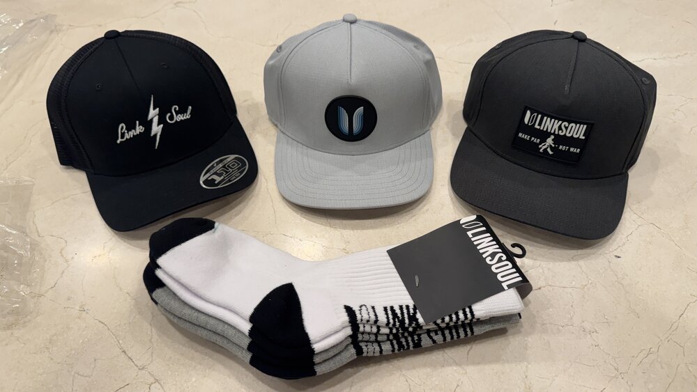Three (3) snapback hats and three (3) socks in assorted styles and colors as seen in photo.