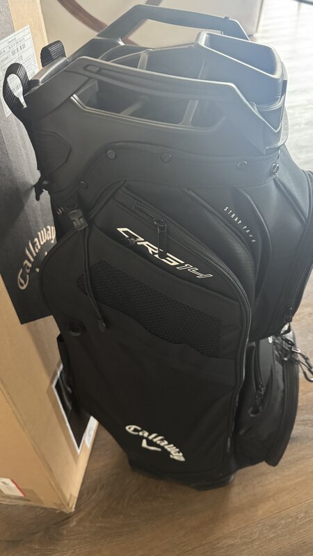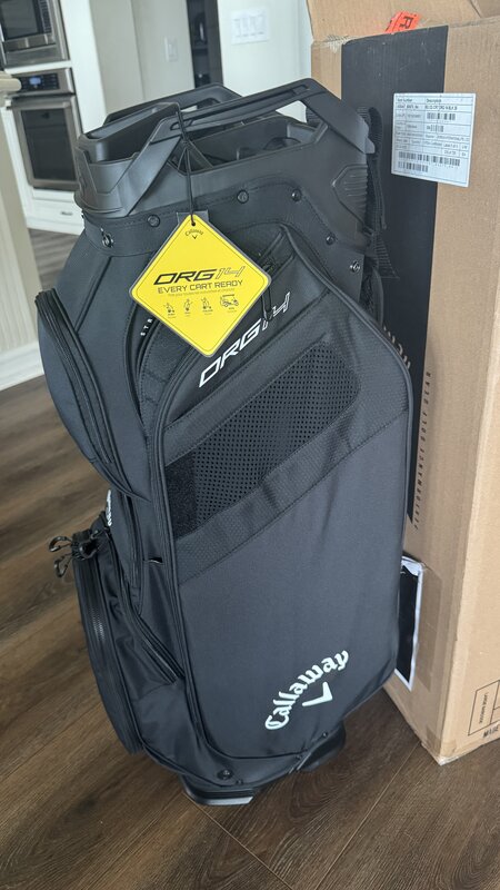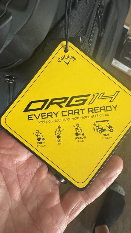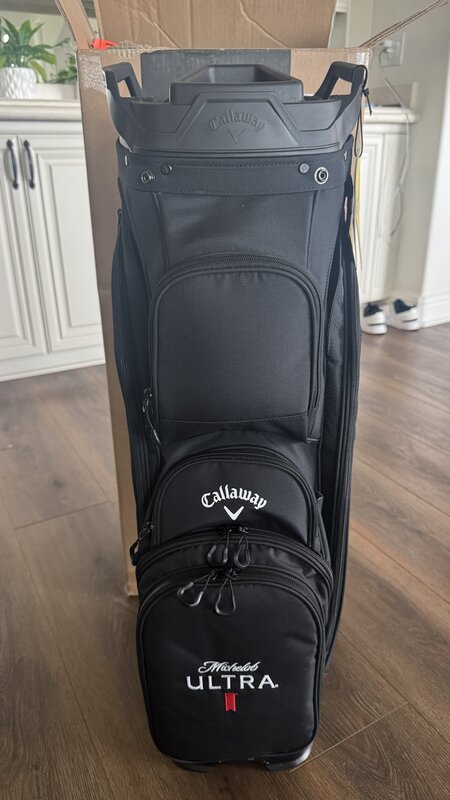 Callaway ORG 14 Cart Bag with Michelob Ultra embroidered front zipper pocket. Features include: 14 club dividers, 7 zippered pockets, 1 magnetic rapid access range finder pocket, 2 side sleeve pockets, 1 oversized, cooler lined pocket.