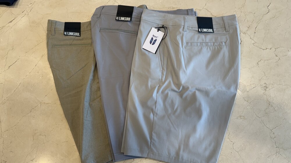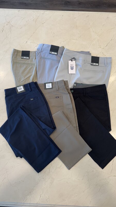 Three (3), size 36" shorts and three (3), 36" pants. Perfect for golf or leisure. Short colors are light blue breeze, light gray and khaki. Pant colors are black, oak, and navy.