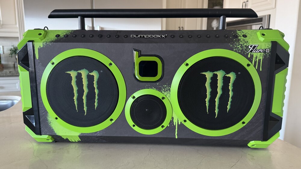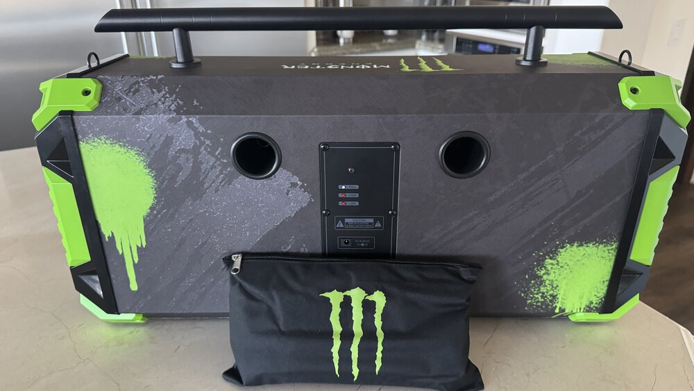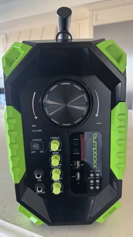 400 W Bluetooth speaker with color changing LED display. Includes two microphones for the ultimate sing-along. Plug in your guitar and play along. One of the highest rated speakers on the market, not sold to the public. Features include dual woofers and tweeters, Bluetooth connectivity, digital stereo amp, TWS true wireless stereo pairing, rechargeable lithium battery with up to 10 hour playtime, type C charging port, SD and USB MP3 player, 5 EQ settings, microphone input, guitar input, low battery indicator, audio, charging block, support strap, and remote control.