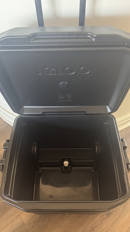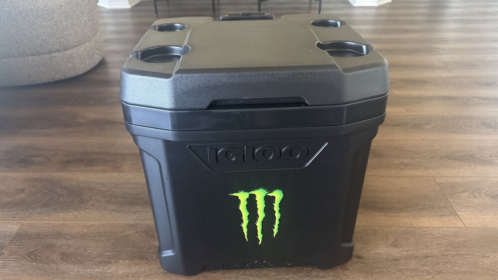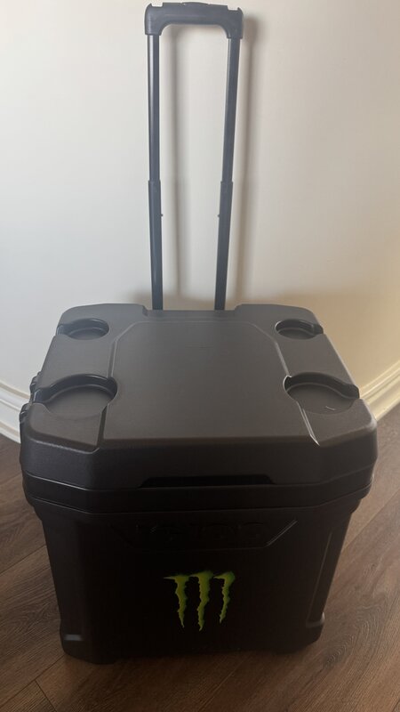 Large capacity, rolling cooler with retractable handle for easy portability, drink holder top and rear drain plug. Black color.