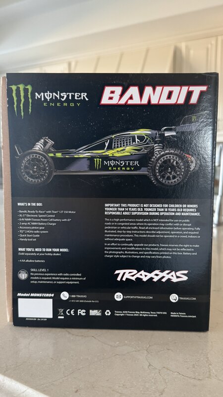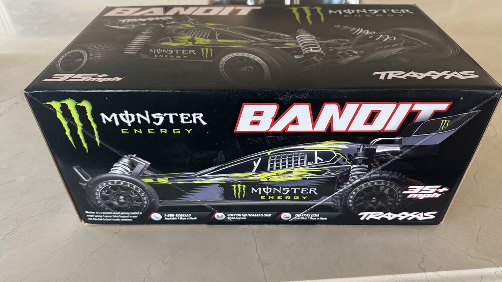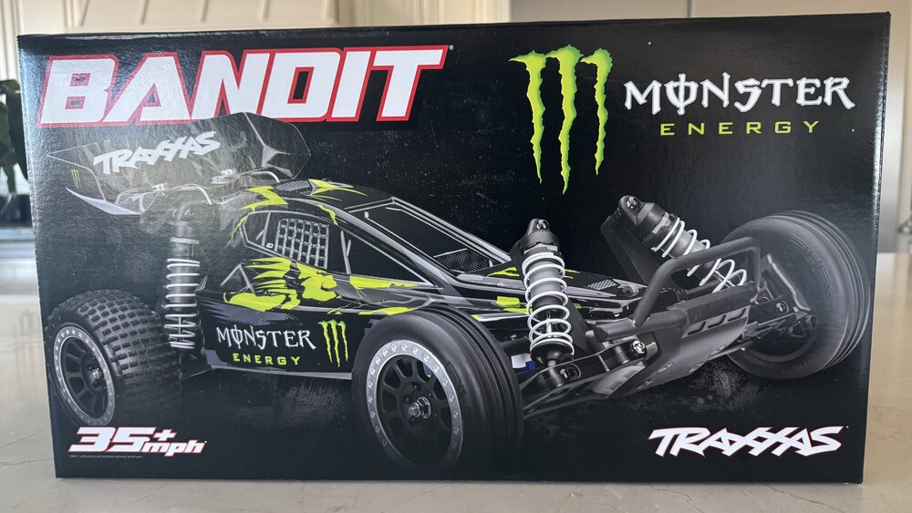 Released in 2025, this custom Monster Energy Traxxas Bandit RC car comes with battery charger. Races up to 35 MPH with beautiful custom Monster Energy design. NOT SOLD IN STORES, LIMITED PRODUCTION.