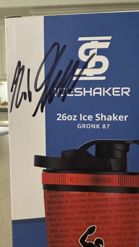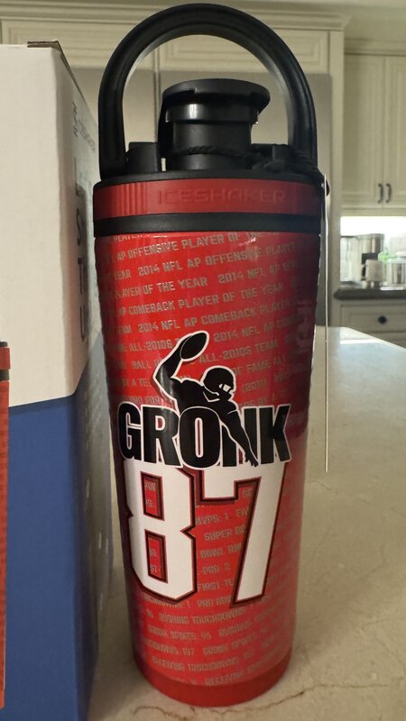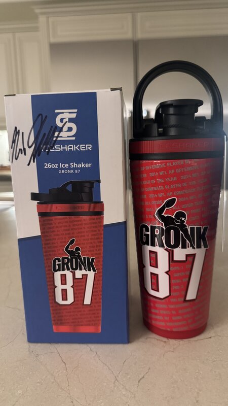 "Gronk 87" water bottle with Rob's autograph on the box. The water bottle is a 26 oz. Ice Shaker gym/workout stainless steel water bottle with removable agitator to mix powdered drinks. Spill and leak proof, holds ice for over 30 hours.