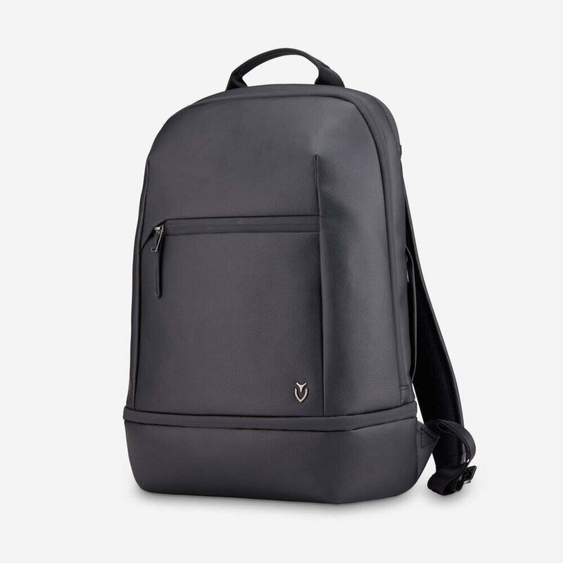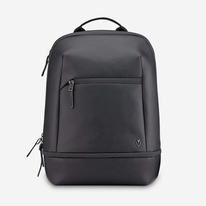 Lightweight, premium quality backpack! Perfect for work and/or travel, pebbled black vegan leather, lined laptop pocket can fit a 16in computer, front zippered compartment for smaller items such as pens, glasses, wallet, etc., bottom separation compartment for shoes, clothing or hat. Dimensions: 12.5"L x 6"W x 18"H