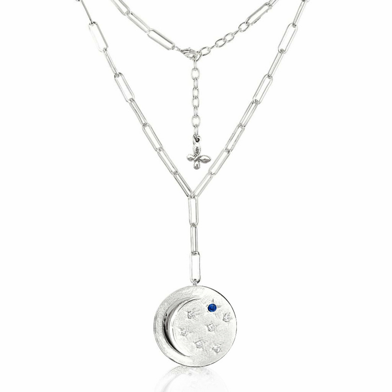 Make a statement in this exquisite pendant necklace, beautifully designed in California and finely crafted in solid 925 sterling silver with world-renowned zirconia - the best simulated diamonds and blue sapphire ever created! Bold yet timeless, it measures 21 inches and it makes a great layering piece. Outstanding packaging for gifting or to hold your keepsakes! Created exclusively for the philanthropic community.