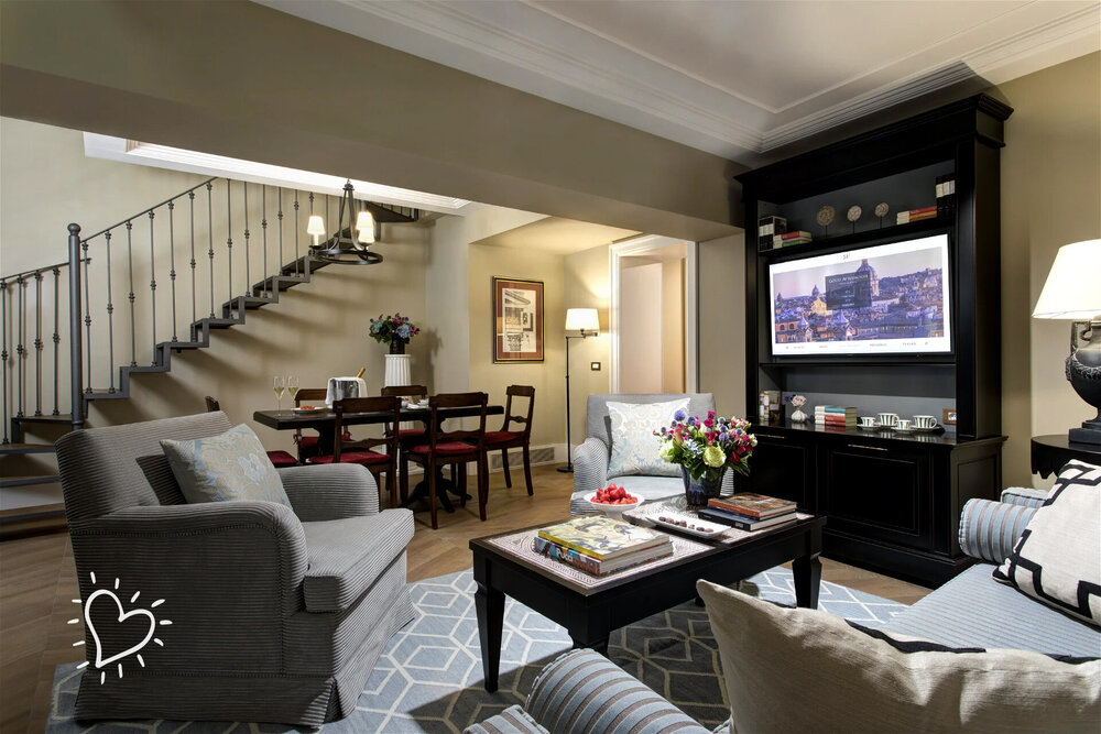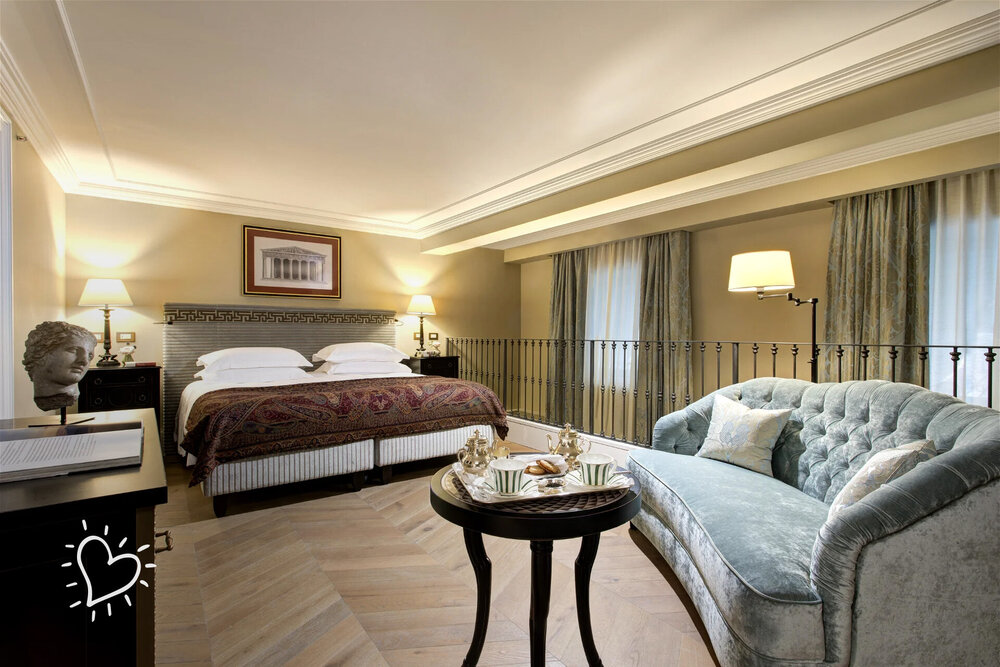 Inspired by Rome’s artistic heritage and contemporary Italian flair, your impressive junior suite spans two floors. Embrace la dolce vita as you unwind in the lavish lounge before retreating to the mezzanine with a majestic King-size bed. Let your cares melt away in your marble bathroom’s indulgent soaking tub.