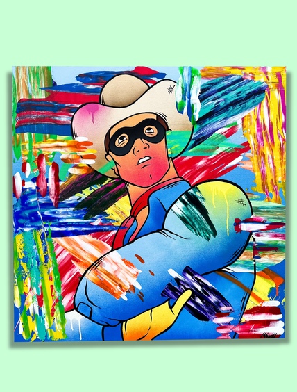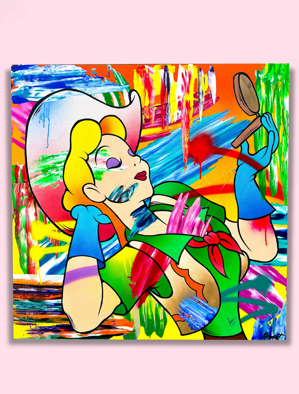 This bold and cheeky piece by artist Matthew Laurence Knott titled “SWEET FOOT SUE,” gives the iconic Western character a glam pop art makeover.