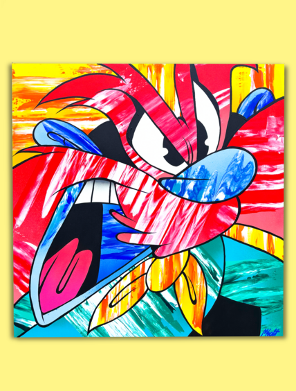 The vibrant background—bursting with neon hues and dripping textures—adds a raw, abstract intensity that contrasts with the clean comic-style line work.