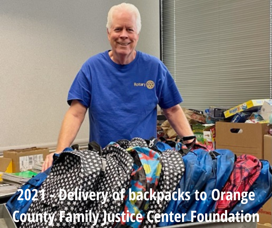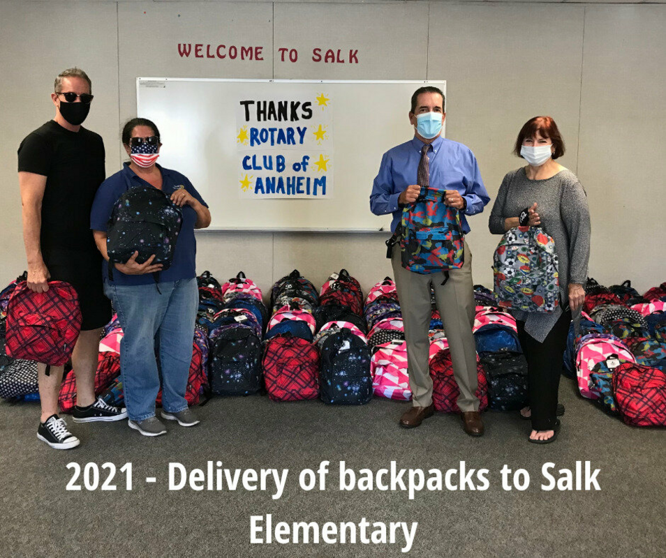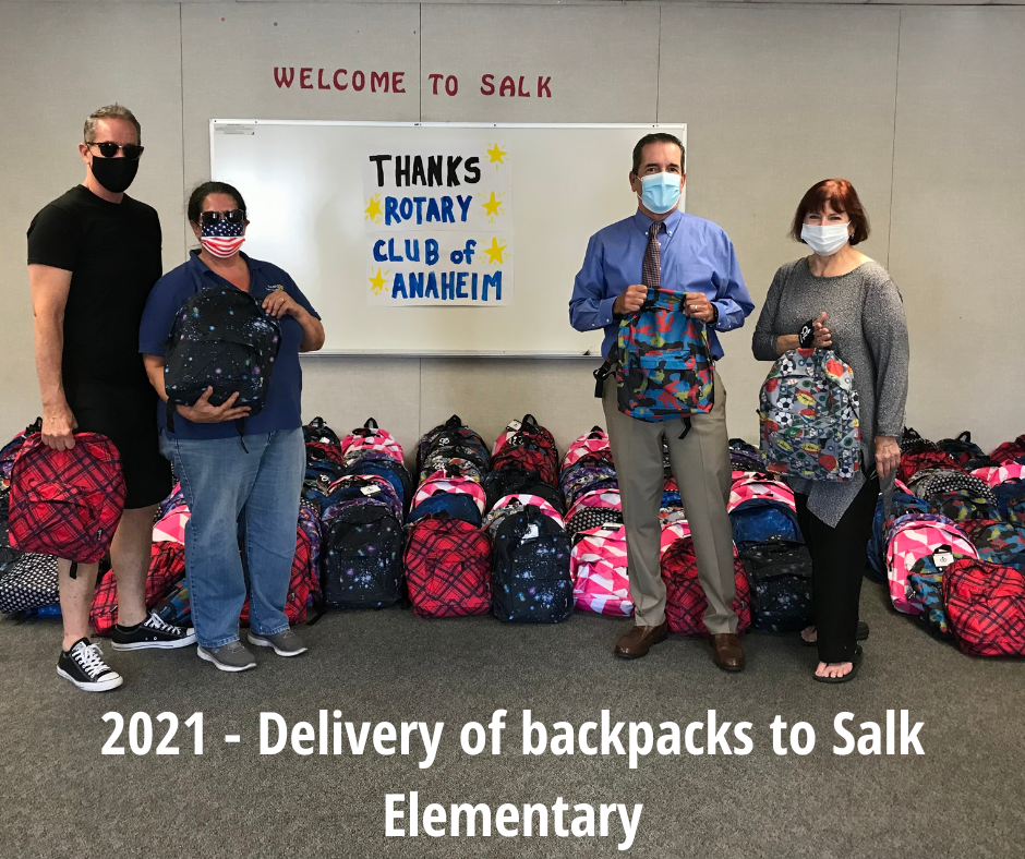 Since 2012, The Rotary Club of Anaheim has provided backpacks to students of the Anaheim. In this program, we annually provide hundreds of backpacks stuffed with all of the school supplies the students will need for their school year. These backpacks are provided to lessor affluent elementary school students in the district who would otherwise have to do without these necessary classroom supplies. Backpacks are also provided to the Orange County Family Justice Center Foundation, for distribution to their clients.