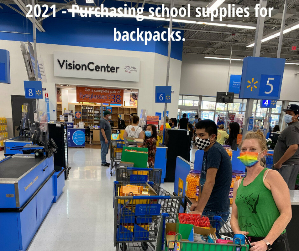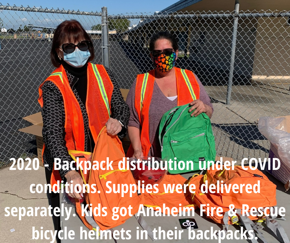 in 2021, we were back, assembling backpacks in person, however, distribution was a drop off with minimal interaction at Salk Elementary, Savannah Elementary and at the Orange County Family Justice Center.