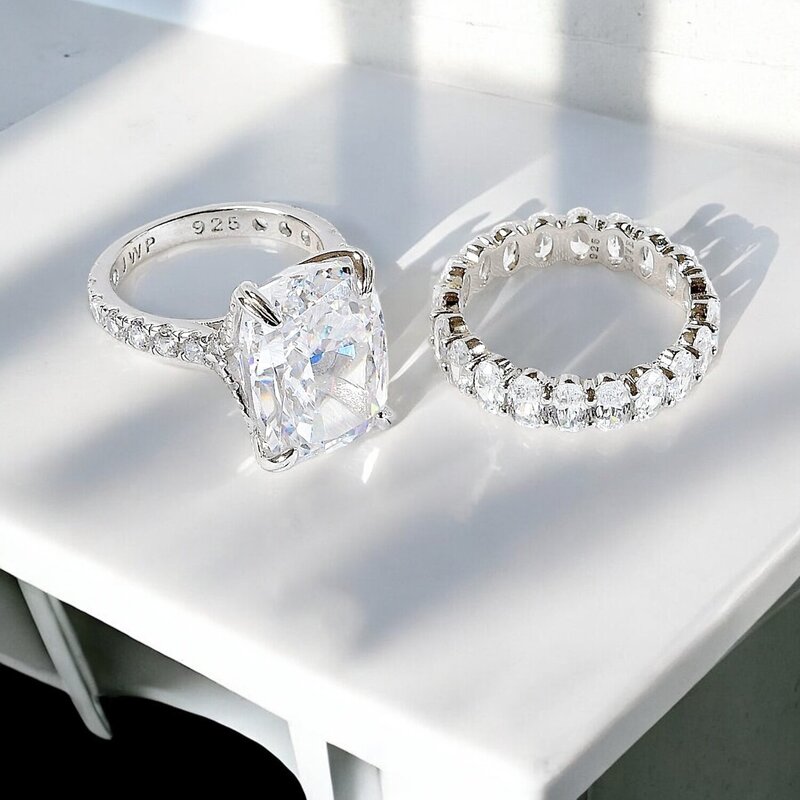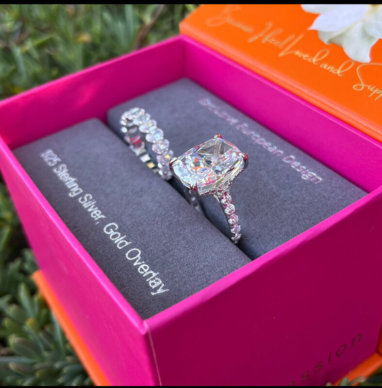 Material: The ring and eternity band are crafted from solid 925 sterling silver and overlaid with platinum to ensure durability and a luxurious finish. Each simulated diamond is carefully selected for its quality and brilliance, providing the look of genuine diamonds without the high cost. Both pieces in the set are hypoallergenic, ensuring comfort for daily wear.
