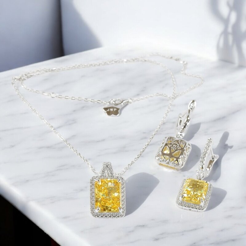 Meticulously crafted in lustrous 925 sterling silver with a gleaming white gold overlay, this exquisite set captures the essence of refined glamour. At the heart of the design lies a dazzling, simulated citrine stone, its golden-yellow hue reminiscent of a sunlit treasure. The stone’s precision-cut facets shimmer with every movement, creating a captivating interplay of light and warmth.