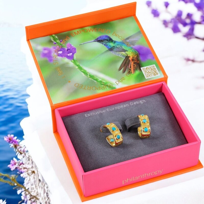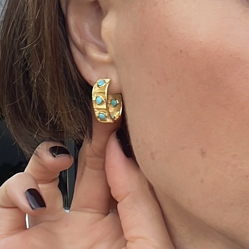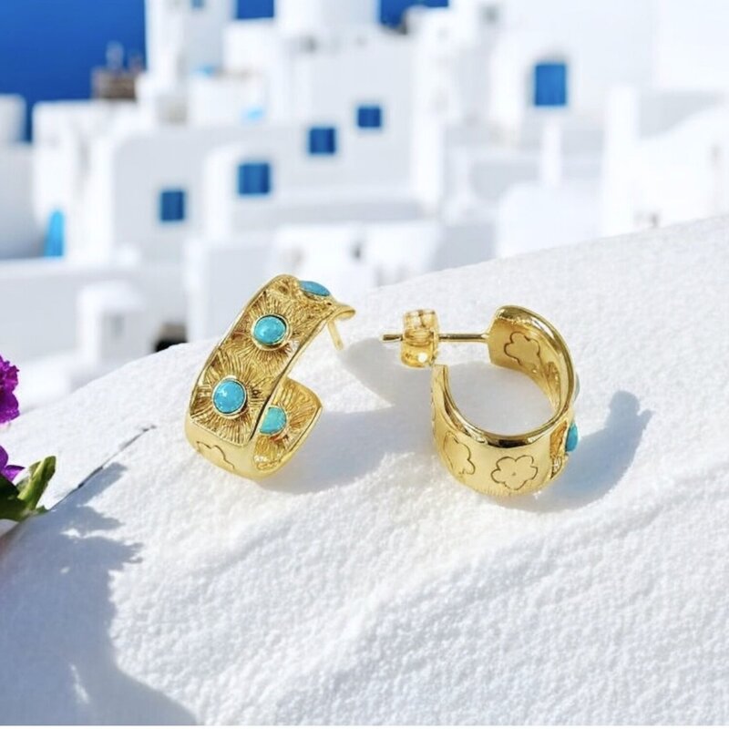 The Santorini Earrings are a masterpiece of elegance and artistry, a radiant blend of timeless design and Mediterranean charm. Crafted from premium 925 sterling silver, finished with a luxurious gold overlay and genuine turquoise, these earrings radiate a golden warmth that enhances their sophisticated allure. Designed in a classic “hug” style, they gracefully embrace the ear, combining comfort with refined beauty.