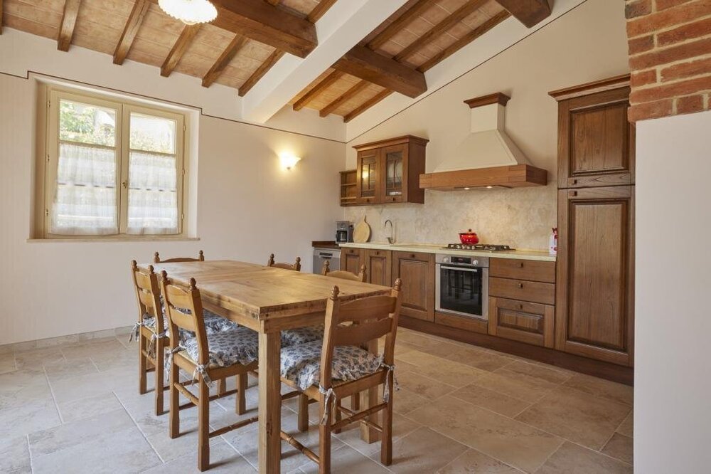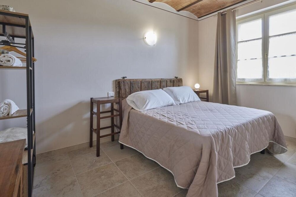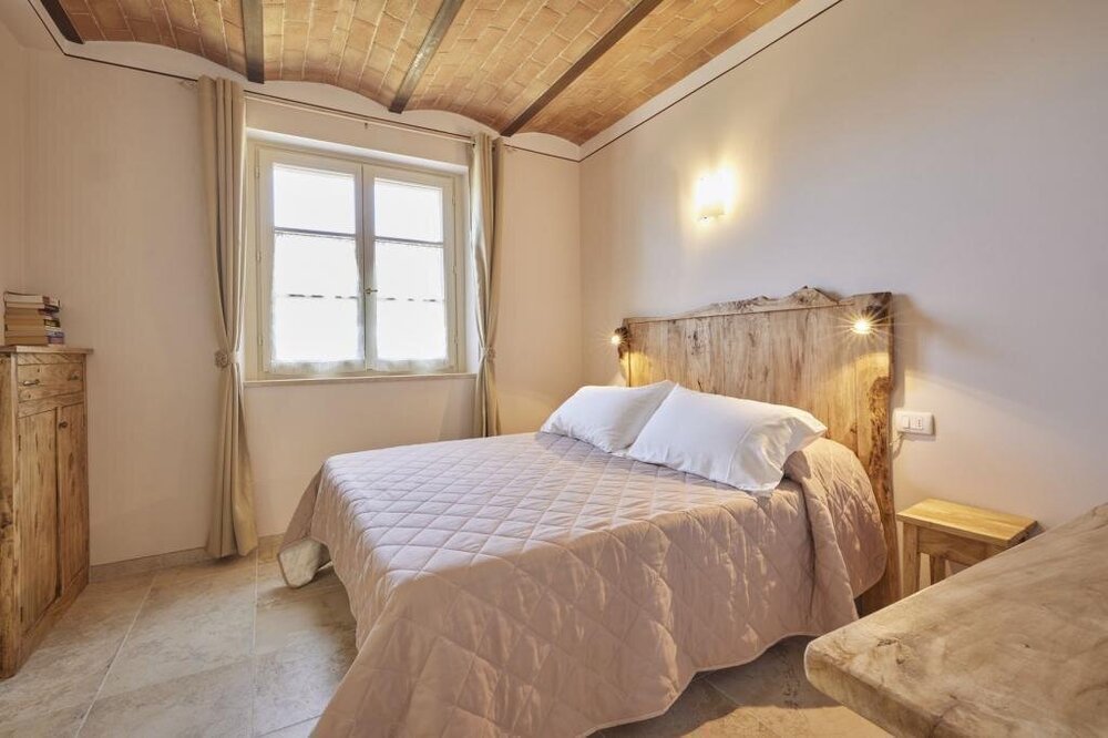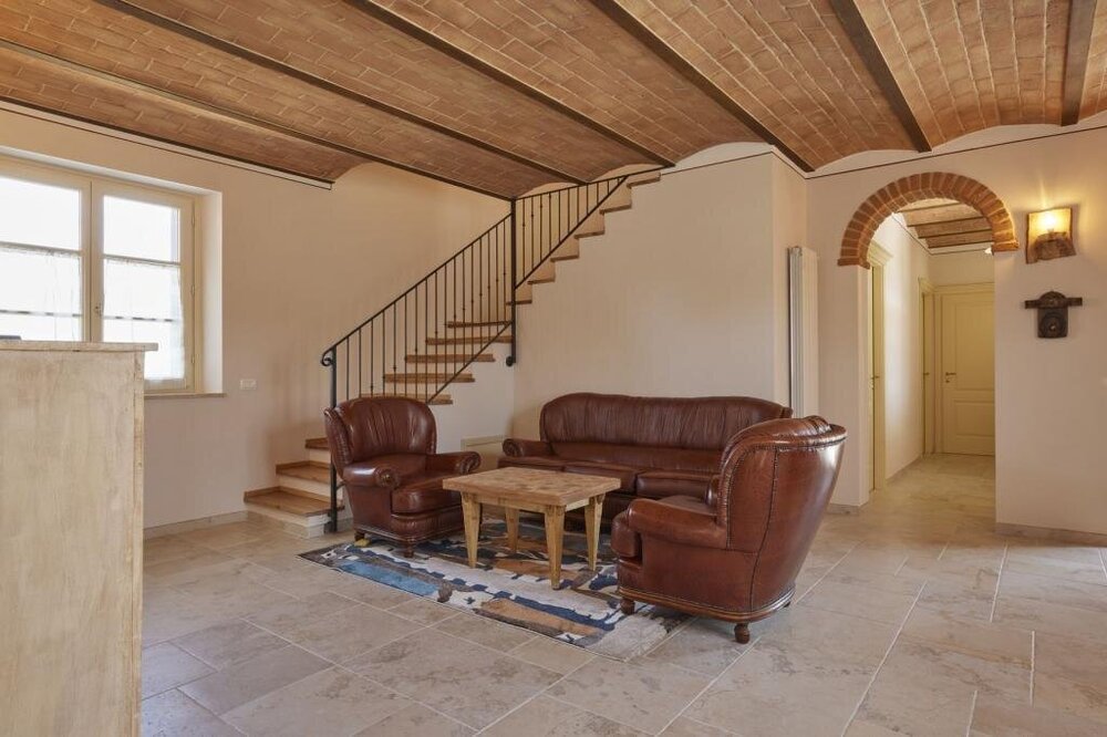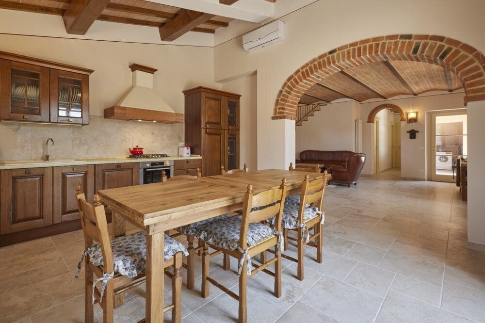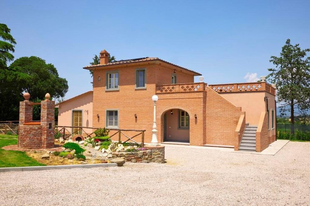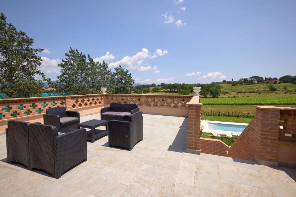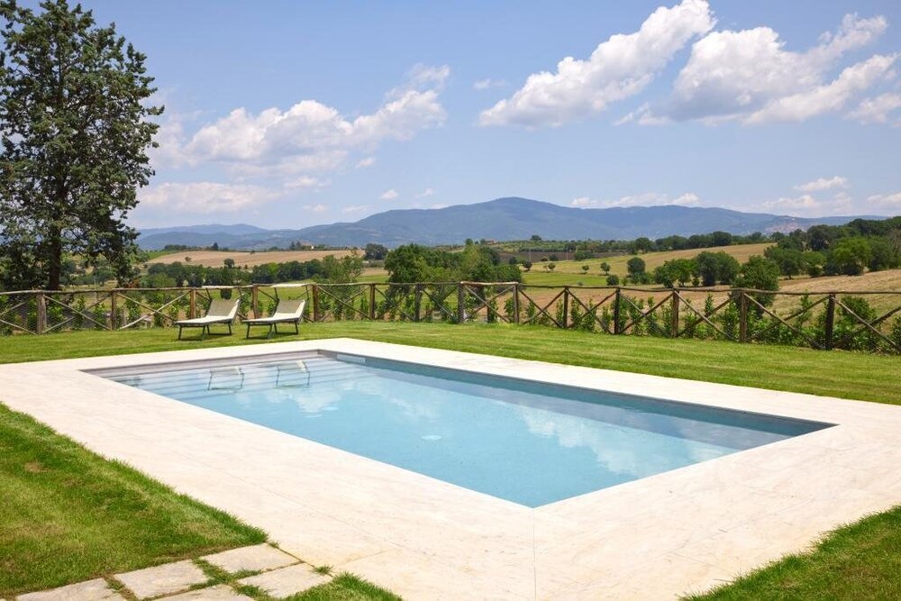 This villa perfectly combines modern amenities with the rustic charm of the Tuscan countryside. Designed to accommodate up to six guests, the villa boasts three spacious bedrooms and three bathrooms, ensuring both comfort and privacy. Spend your days soaking up the sun on the expansive terrace, where you can marvel at the breathtaking views of the Chiana Valley and the ancient hill town of Cortona in the distance. The villa's outdoor oasis includes a sparkling pool and lush, green gardens, creating the ideal setting for relaxation or a peaceful afternoon with a good book. This enchanting retreat offers a serene and picturesque backdrop for an unforgettable Tuscan vacation.