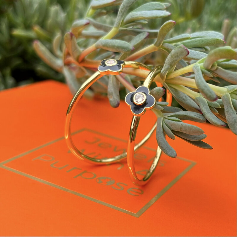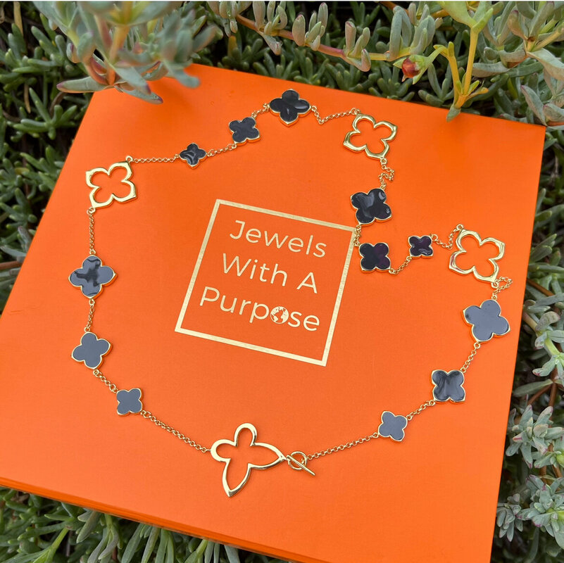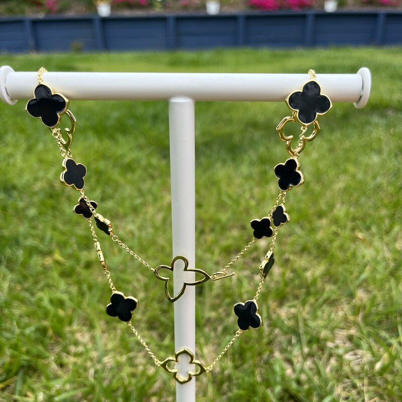 Black Flowers and Butterflies Necklace and Earrings in Yellow Gold