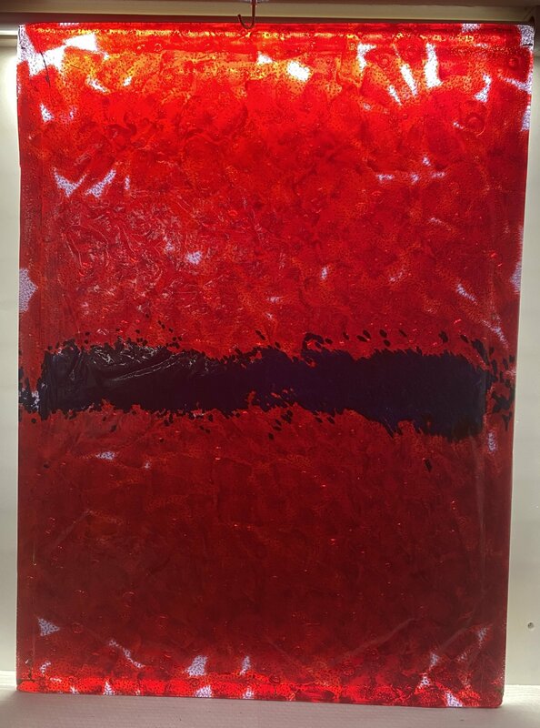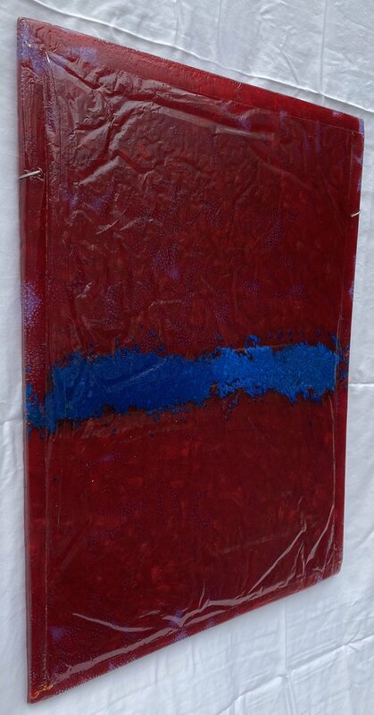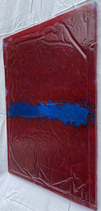 Deep red, clear, and blue plastic form a blue stripe that does not divide the red but is passing through from left to right. Distracted by texture, the longer the viewer stares at the blue stripe, the slower it progresses until its movement is frozen in place.