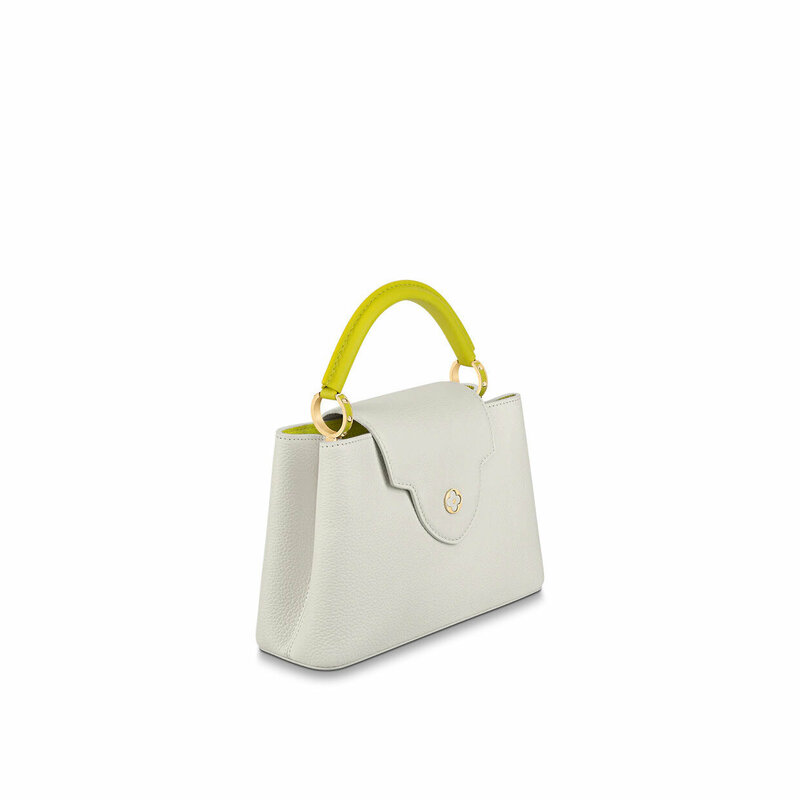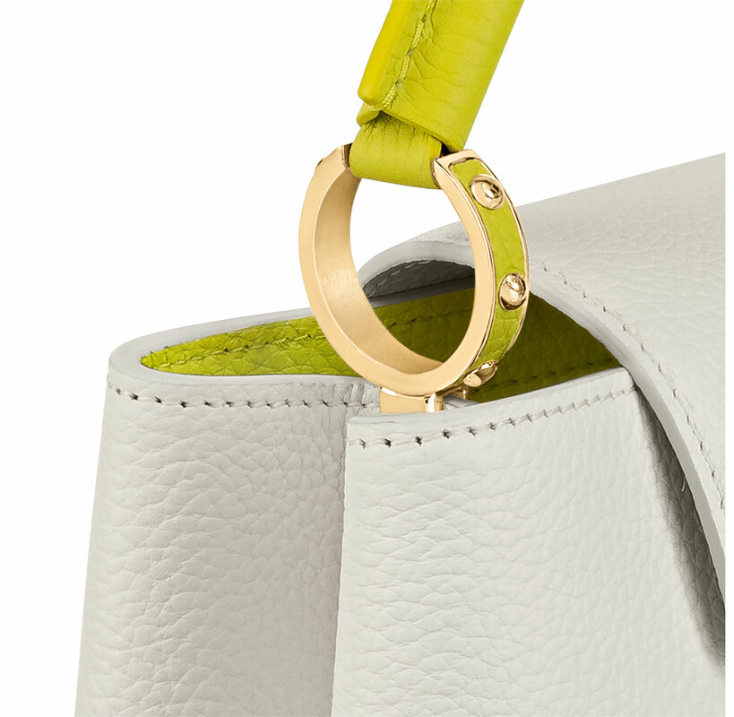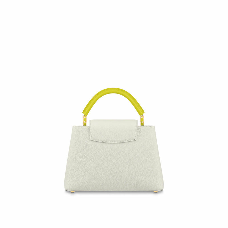 The Capucines BB handbag is made from two-tone full-grain Taurillon leather with the signature LV Initials in a bold yet delicate color. The lining is in a fresh contrasting smooth leather. The BB Capucines size boasts all the iconic details – LV Initials, distinctive side rings, and subtle Monogram Flower on the flap.