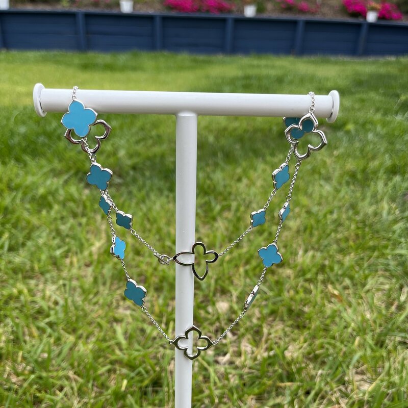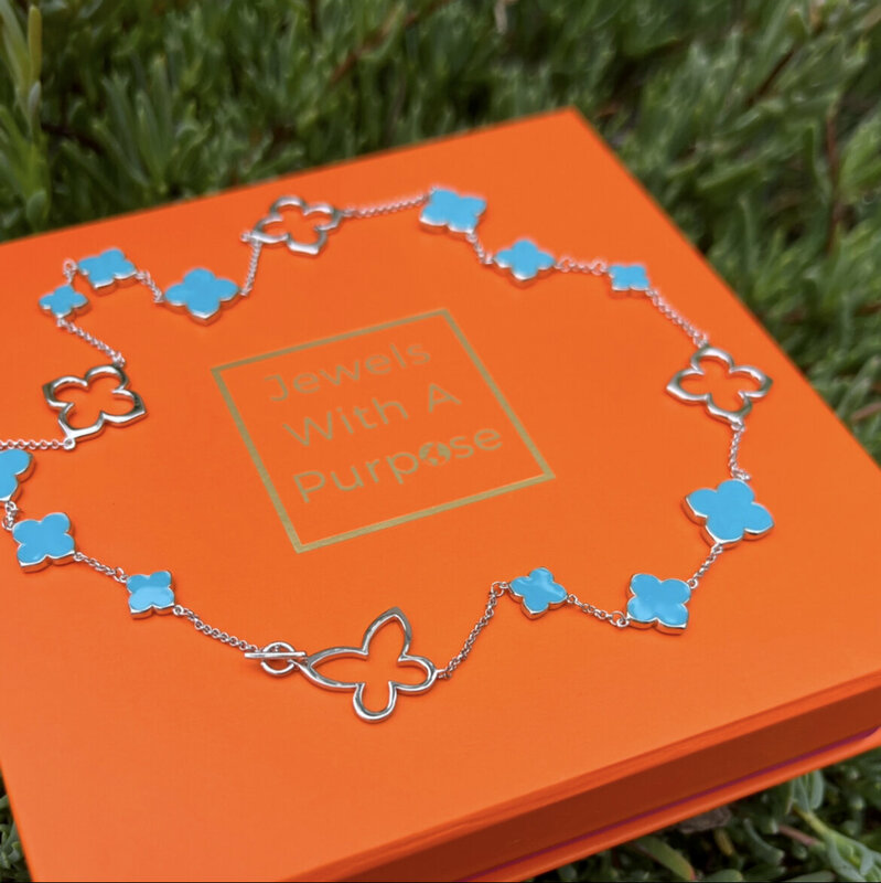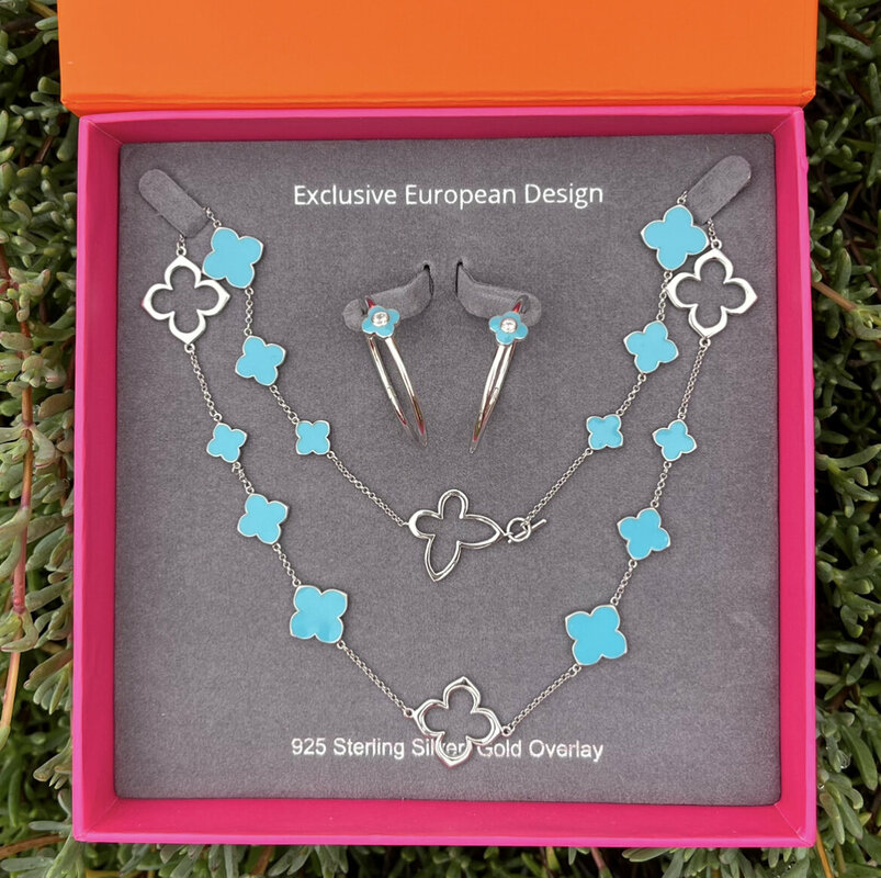 Turquoise Flowers and Butterflies Necklace and Earrings in White Gold