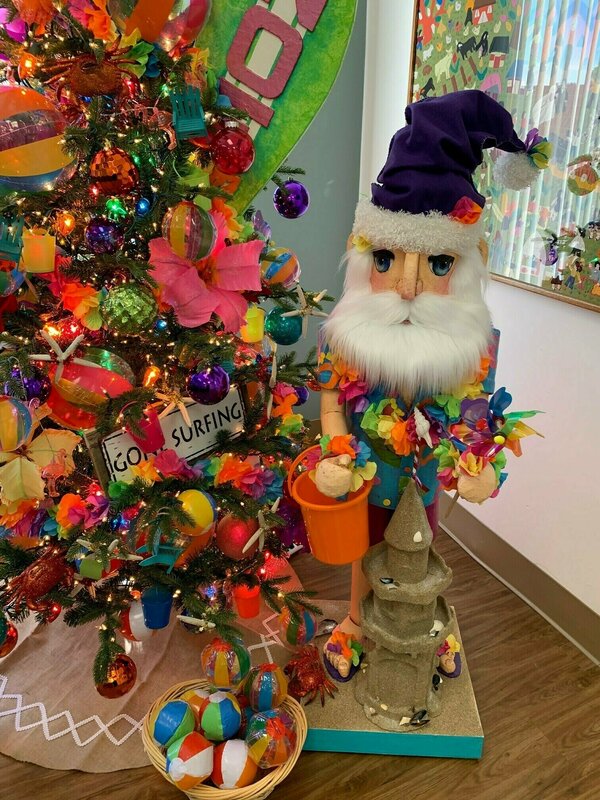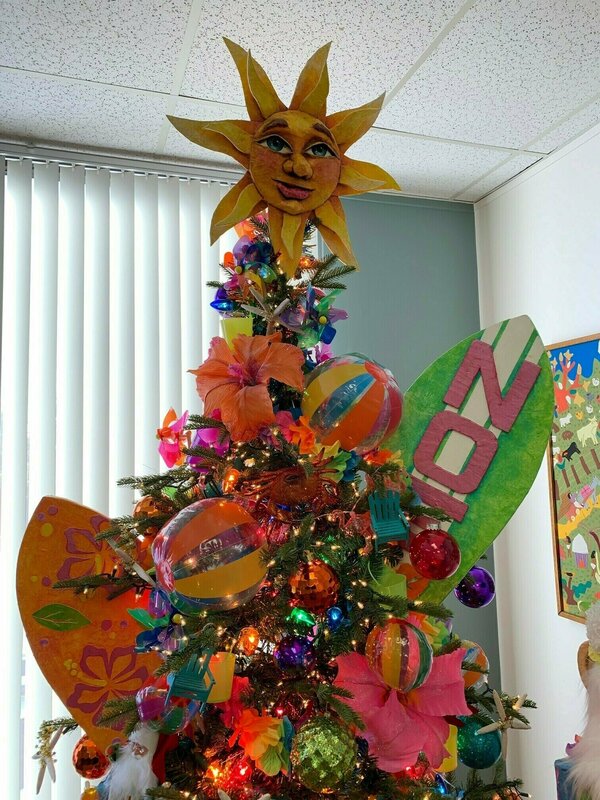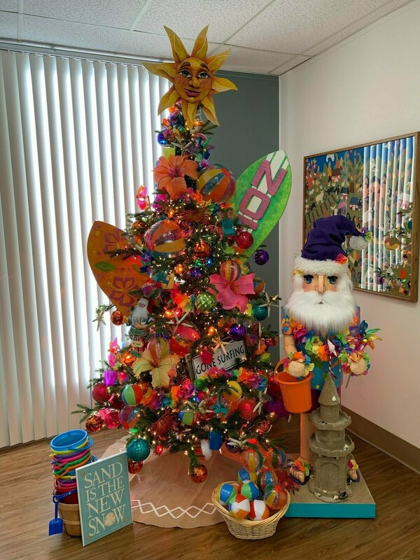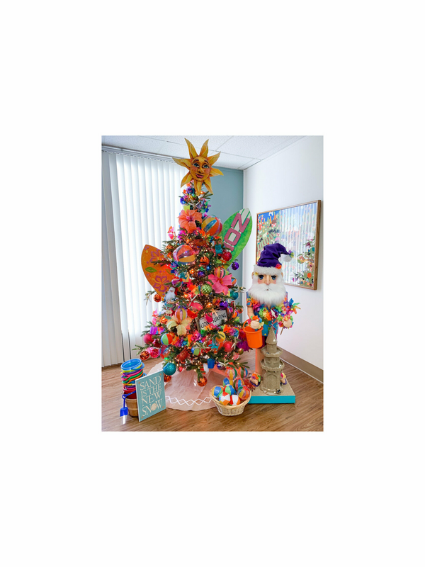 In honor of Child Guidance Center's Annual Holiday Tree Fantasy, we are excited to provide this amazing opportunity to win this one-of-a-kind beach-themed Christmas tree adorned with handmade decorations by artist Linda Frysinger and special decorations by Aimee Newell. The winning bidder will have this gorgeous tree delivered to their home (must be in Orange County) at no cost. This gorgeous tree stands 8' 5" and a width that spans up to 5 feet. This beauty will shine bright in your home (or business) creating smiles of joy. The artificial tree includes glittery crabs, beautiful hibiscus flowers, beach balls, flamingo lights, and handmade paper Mache decorations - including Santa at the beach with his sand castle. Let this become your new family heirloom.