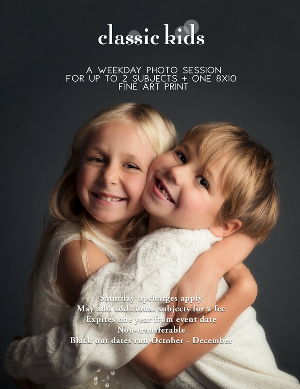 Let Classic Kids iconic fine art photography capture a special moment with up to two subjects - a keepsake forever. Includes complimentary in-studio photo session and complimentary 8" x 10'" fine art print
