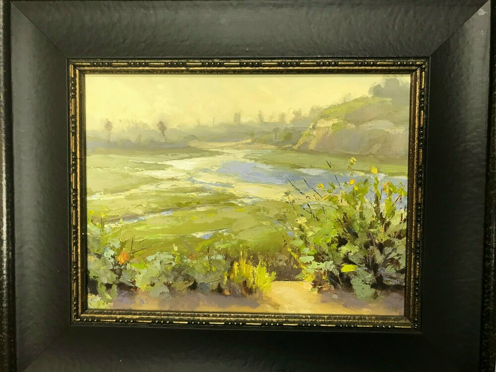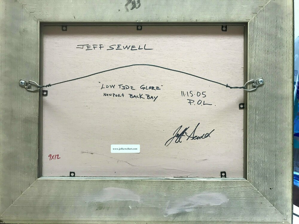 Bring home this beautiful plein air oil painting by Orange County artists Jeff Sewell. Entitled "Low Tide Glare" this framed painting showcases the natural beauty of the Newport Beach Back Bay. This 9" x"12 print (with frame: 14" x 17") is signed by the artist. Jeff Sewell is an Award winning American Artist, focusing in California Impressionism. Awarded The 2015 Laguna Beach Plein Air invitational "Collectors Choice Award" and "the Randy Higbee Award of Excellence" In 2011 Jeff Received “Collectors Choice” during the prestigious Laguna Beach Plein Air invitational, plus many more other accolades and awards. In 2013 “Laguna Canyon Foundation Award” Laguna Beach Plein Air invitational. Growing up in Orange County has attached Jeff deeply to the ocean life style. “My dream days start with a surf in the morning and then spending the day with my feet in the sand painting seascapes and beach scenes”.