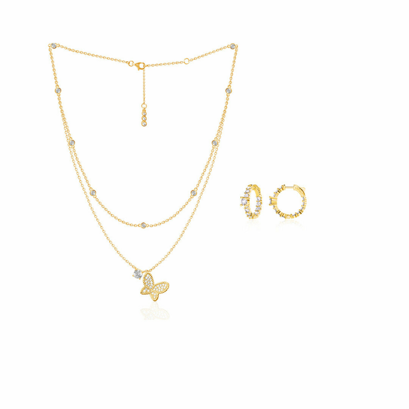 Daring and glamorous, these lovely jewels radiate timeless elegance. A stunning butterfly with pave zirconium is the symbol of COURAGE, FREEDOM & HOPE! Hypoallergenic and finely crafted in 925 sterling silver with gold overlay and world’s renowned European zirconia - the best simulated diamonds ever created! The necklace features an 18-inch adjustable chain and the earrings are very stylish with our signature safety clasp. Outstanding packaging for gifting, storing or for travel! Complete the set by purchasing item No. 4 - butterfly bracelets.