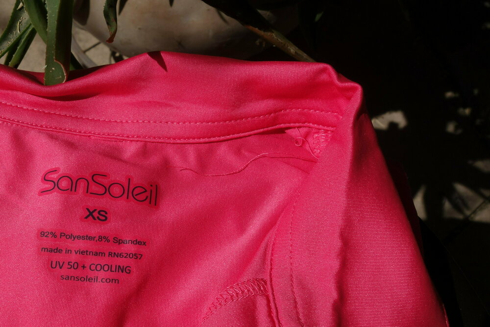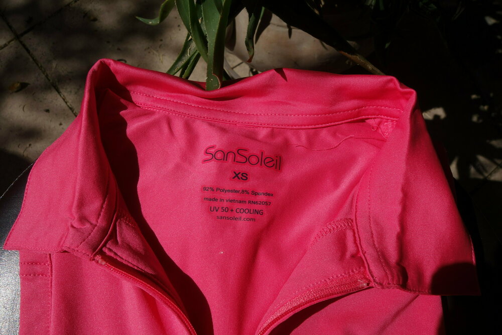 Each shirt has UV protection. SanSoleil's Cooling Fabric SolStyle ICE. SanSoleil combines 85% Super Cooling Nylon and 15% Sport Spandex Stretch technology with 7% Athletic Stretch Spandex to create the most comfortable Sport Dress for golf and tennis! SOLCOOL SHORT SLEEVE POLO. SanSoleil "SolCool Fabric" Performance Fitted Zip polo offers moisture-wicking, quick-dry, and cooling ventilation. And, most importantly, UPF 50 Protection