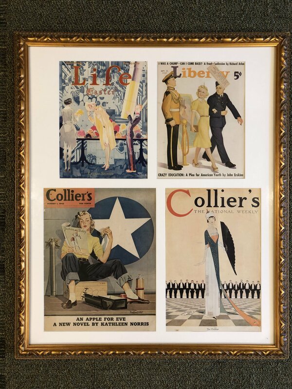 Collection of vintage magazine cover art from 1927-1942 in conservation-grade frame, colorfully depicting scenes from American life leading up to and during the WWII era. Great piece for the history or art enthusiast!"