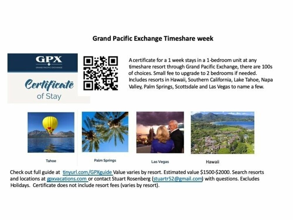 Certificate for a one week stay in a one bedroom unit at any timeshare resort through Grand Pacific Exchange. Small fee to upgrade to two bedrooms if needed. Includes resorts in Hawaii, Southern California, Lake Tahoe, Napa Valley, Palm Springs, Scottsdale, and Las Vegas - just to name a few. Exchange is based on space available on the Exchange website.
