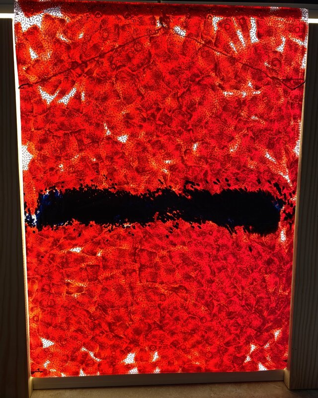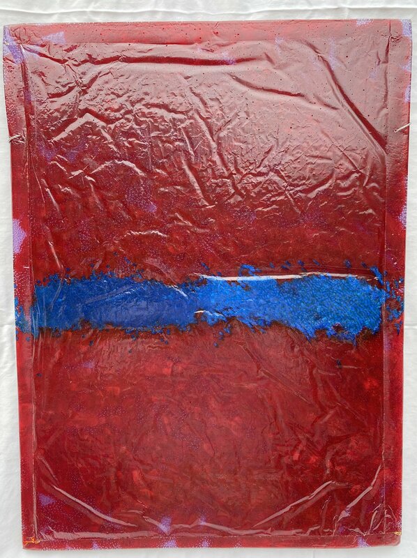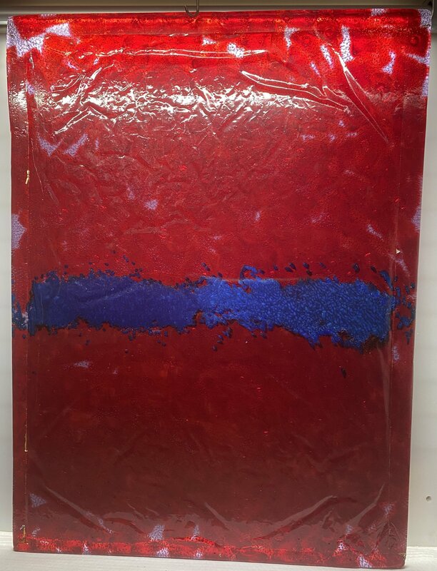 Deep red, clear, and blue plastic form a blue stripe that does not divide the red but is passing through from left to right. Distracted by texture, the longer the viewer stares at the blue stripe, the slower it progresses until its movement is frozen in place.