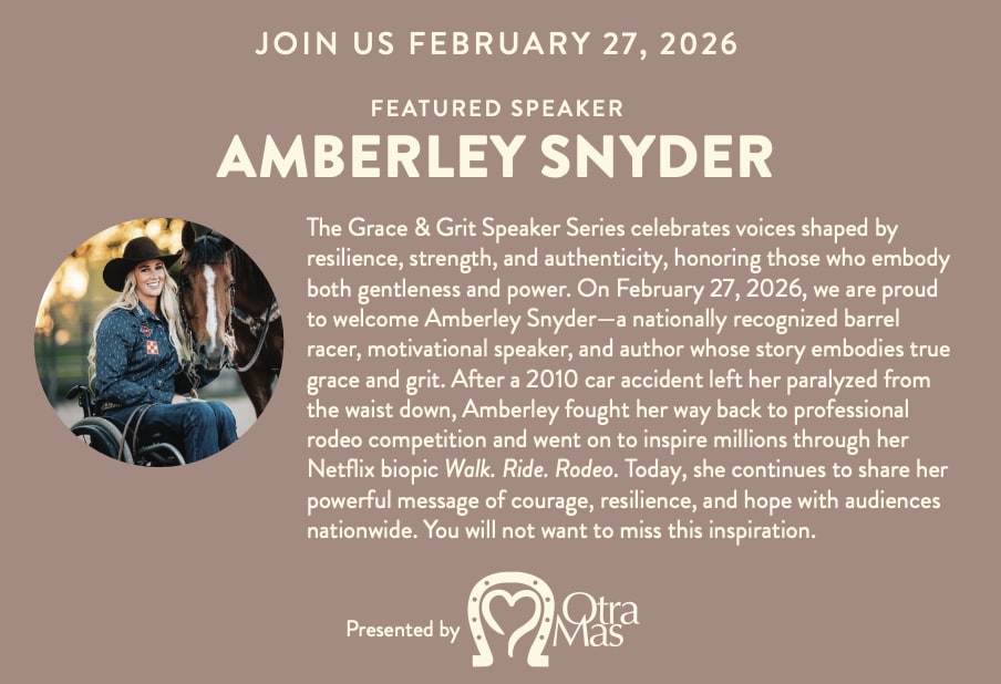 The Grace & Grit Speaker Series was born from a deep desire to create space for voices shaped by resilience, strength, and authenticity. Set against the backdrop of Southern California’s rich ranching heritage and rooted in the enduring spirit of the horse, this series honors individuals who embody a rare blend of gentleness and power, grace in motion, grit in purpose.