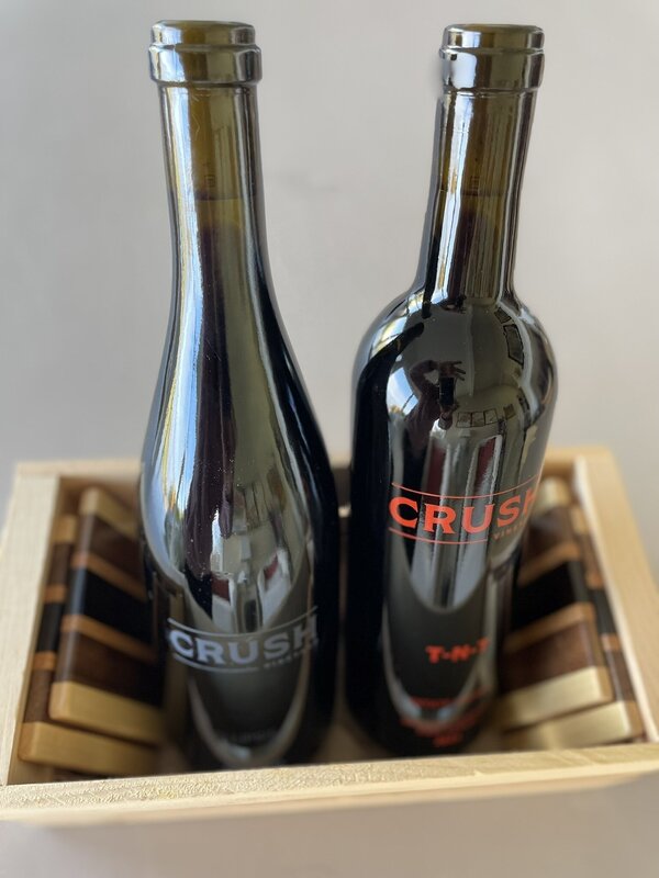 Upgrade your entertaining game with this refined bundle featuring two bold wines from CRUSH Vineyard—T-N-T Tempranillo/Tannat Blend and ELLIPSIS Petite Sirah/Tempranillo/Tannat Blend—paired with a set of beautiful handmade wooden coasters.