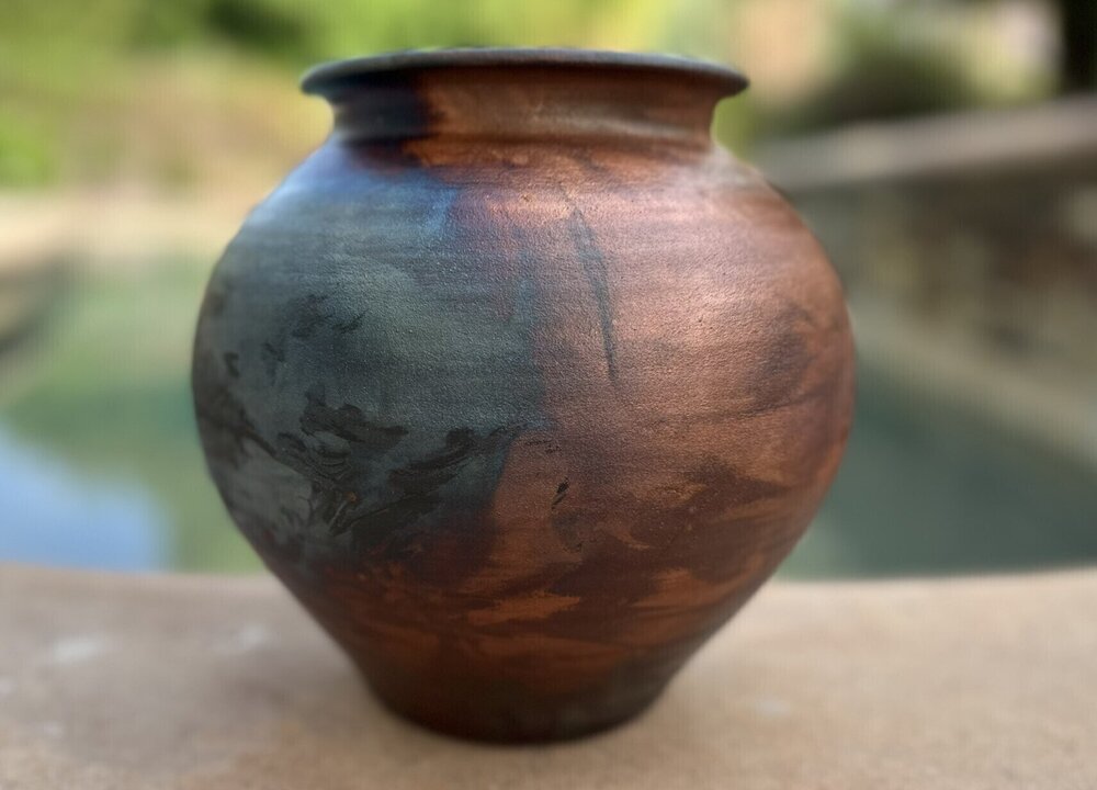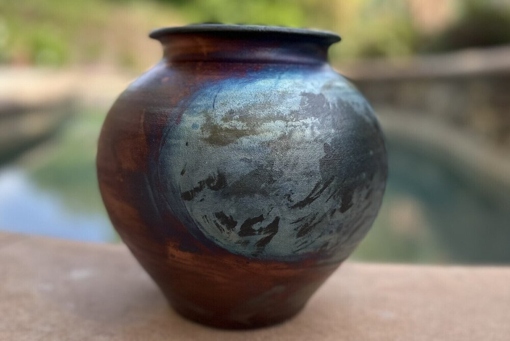 A beautiful Raku ceramic vase by Brennan Raku Ceramics, featuring rich textures and a distinctive, fire-kissed finish. This vase is a one of a kind piece, bringing warmth, artistry, and natural elegance to any space. 8"h x 9" w