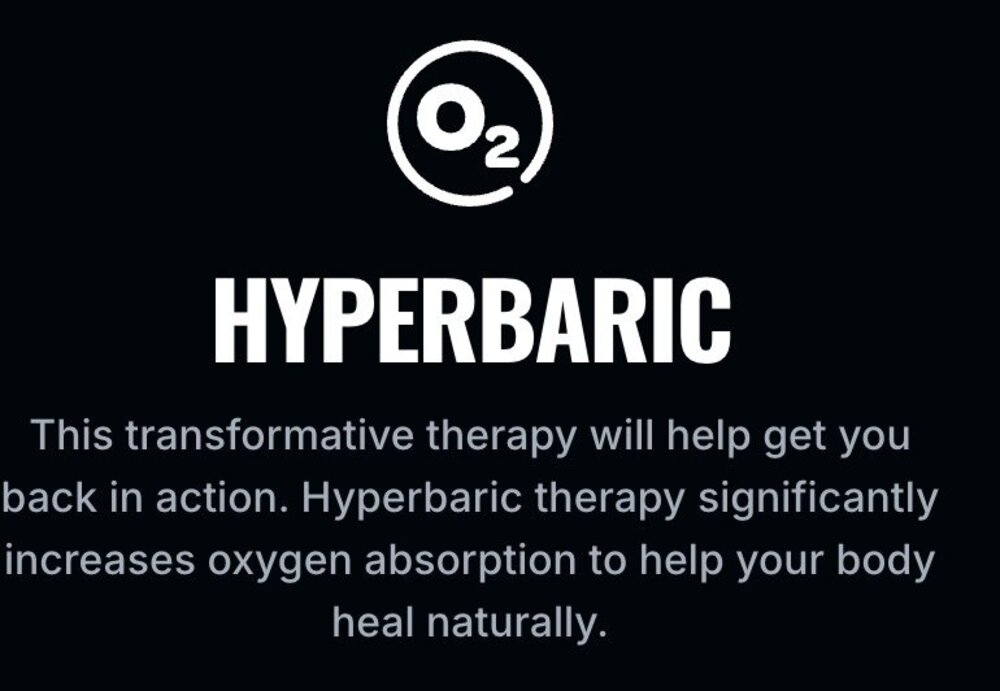 (1) session. This transformative therapy will help get you back in action. Hyperbaric therapy significantly increases oxygen absorption to help your body heal naturally.