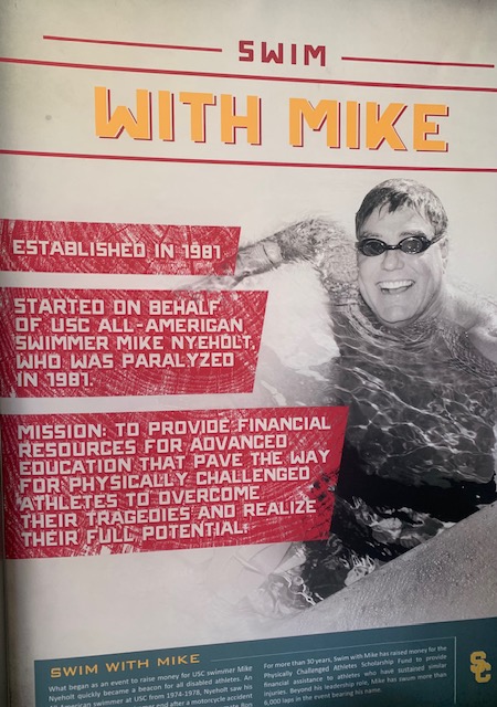 I feel a special personal connection to the SWM Foundation due to my own serious accident as a teenager in which I fell from an avocado tree and broke my neck (fracture dislocation of C-2, C-3 and C-4) on April 12, 1974. I was extremely fortunate that I was not paralyzed in the accident. The more I swim and raise funds for this cause, the more I learn about the Swim With Mike scholarship recipients who sustained life-altering injuries and their amazing outlook on life. In addition, I continue to learn more each year about how fortunate I was that I was not paralyzed. As a result, I feel I owe it to the SWM scholarship recipients to raise as much SWM funds as I can (and swim as far as I can) for as many years as possible.