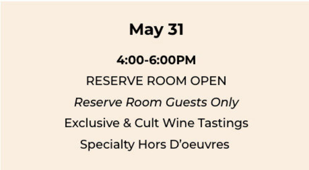 Secure your tickets to the most exclusive wine event in the South Bay. These Reserve Room tickets are for the specialty tasting room from 4pm-6pm and general tasting areas of the Manhattan Wine Auction on Saturday May 31st, 2025. These tickets normally sell out within minutes! Reserve Room guests have the unique opportunity to enjoy the most exceptional cult wines from Napa Valley and beyond, as well as hearty hors d'oeuvres from several featured local restaurants. This limited ticket includes the tastings in the exclusive Reserve Room follow by access to the Vineyard Courts included with General Admission.