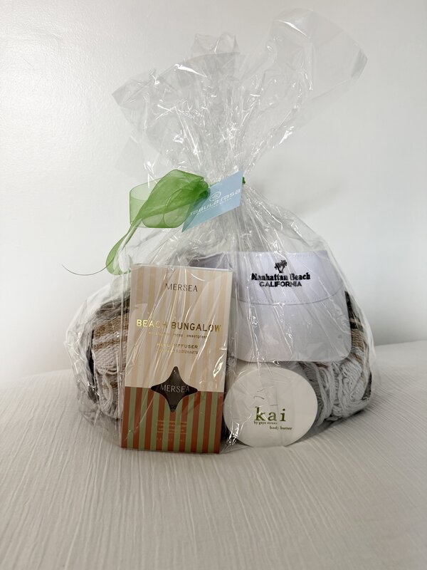 Get summer ready with a gorgeous gift basket from Tabula Rasa featuring a lovely Mexican beach blanket, a Mersea Beach Bungalow Reed Diffuser, kai Body Butter and a Manhattan Beach white visor.