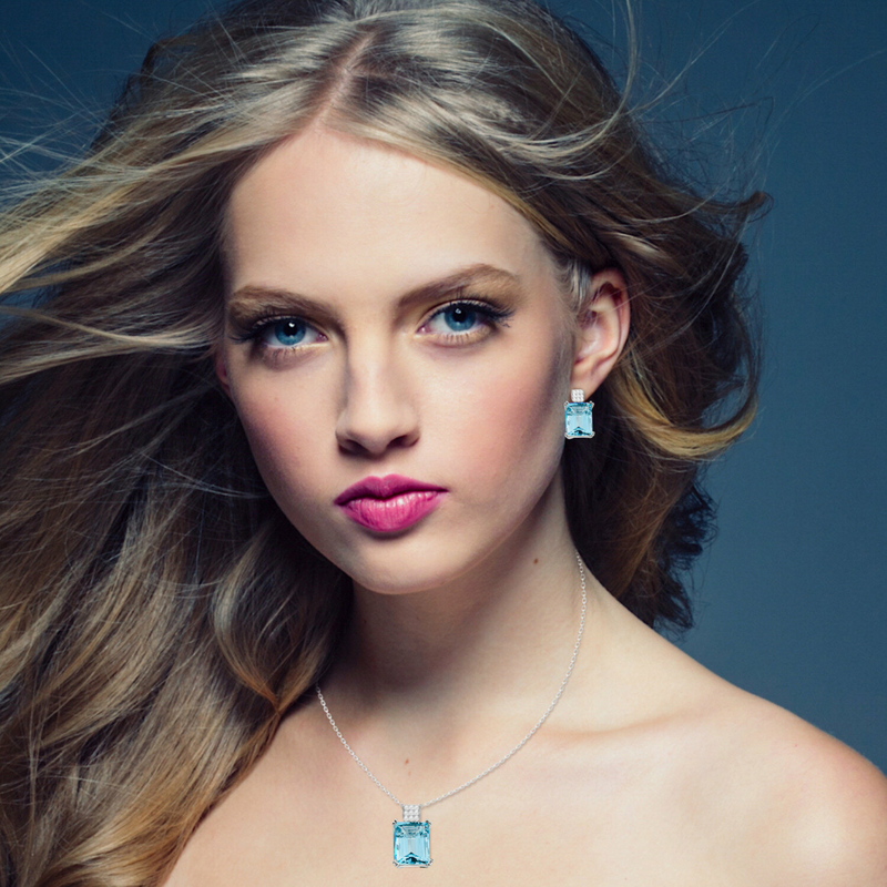 Make a statement in these exquisite jewels, European style, designed in California and finely crafted in solid 925 sterling silver with heavy gold overlay and world-renowned zirconium – the best simulated aquamarine and diamonds ever created! Bold yet timeless, this lovely set is a head-turner and makes the perfect travel accessory! Both hypoallergenic, the necklace features a standard 18-inch adjustable chain. The post earrings have safety backings with silicone inside, to secure them from moving. Outstanding packaging for gifting or to hold your keepsakes! Created exclusively for the philanthropic community.