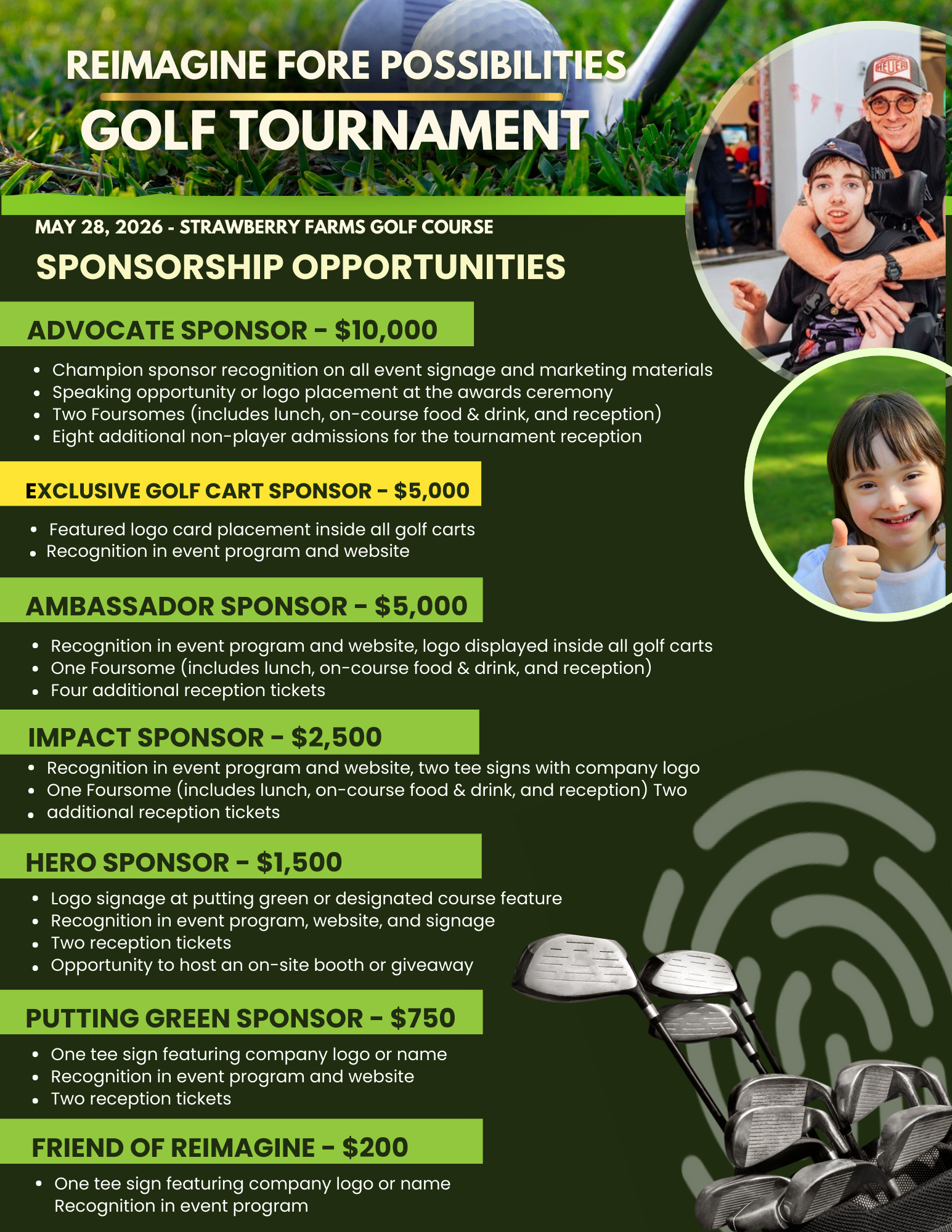 Includes logo signage at putting green or designated course feature, recognition in event program, website, and signage, two reception tickets, and opportunity to host an on-site booth or giveaway. Reception begins at 1:30 PM featuring a raffle, live auction, silent auction, mulligan packages, and s