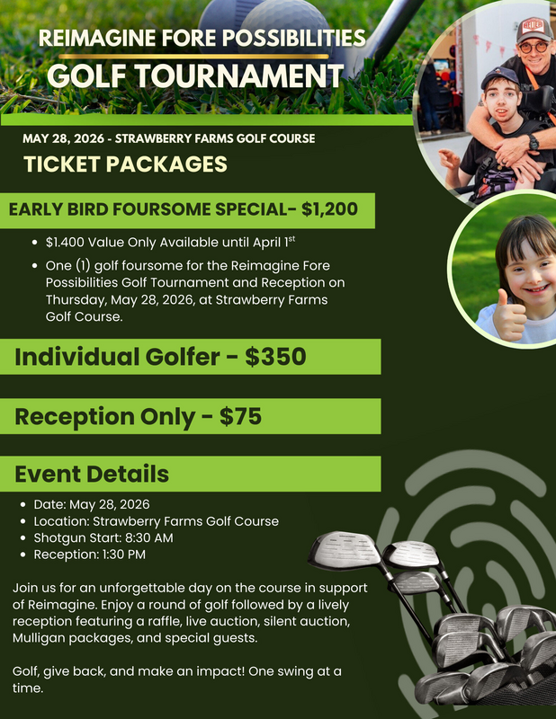 Join us for Reimagine’s annual signature fundraising event, the Reimagine Fore Possibilities Golf Tournament, a day of community, purpose, and impact on the course. Hosted by Reimagine, this special event supports children and adults with disabilities as we work to fulfill our mission: “To reimagine and relentlessly pursue possibilities throughout the lifespan of every person with disabilities.” Every swing, sponsorship, and shared moment helps expand life-enhancing programs and opportunities for those we proudly serve.