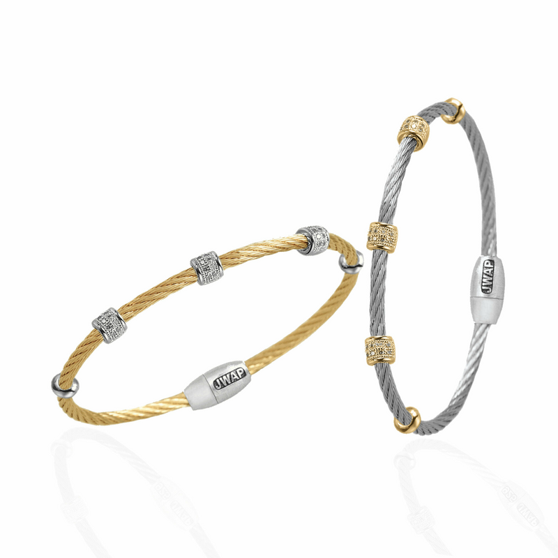 Classy, stackable cable bracelets are pure arm candy! Exceptional quality, including a magnetic closure, these stunners are hypoallergenic and boast three micro-pavé stations on stainless steel cable, hand brushed with rhodium and yellow gold. Medium size fits most wrists. In this case, too many are never too many! Outstanding packaging for gifting or to hold your keepsakes! Created exclusively for the nonprofit community!