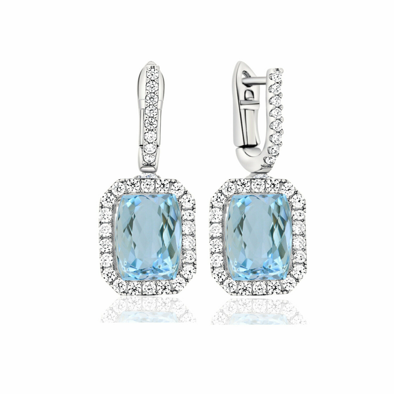 Make a statement with these exquisite earrings, beautifully designed in California and finely crafted in Europe, in solid 925 sterling silver with gold overlay and the world’s most desirable zirconia, emerald cut to shape - the best-simulated diamonds and aquamarine ever created! Bold yet timeless, they make the perfect travel accessory! Hypoallergenic. Lever back. Outstanding packaging for gifting or to hold your keepsakes! Created exclusively for the philanthropic community.