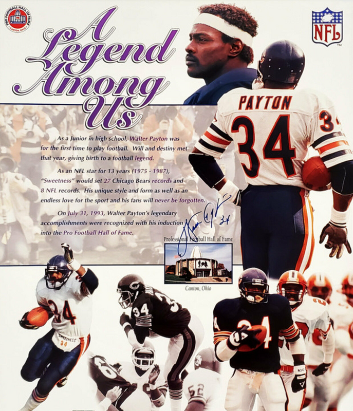 Walter Payton was a running back for the NFL’s Chicago Bears and is remembered as one of the “greatest football players of all time”. “A Legend Among Us” is a poster of Payton from playing with the Bears and is signed by him.
