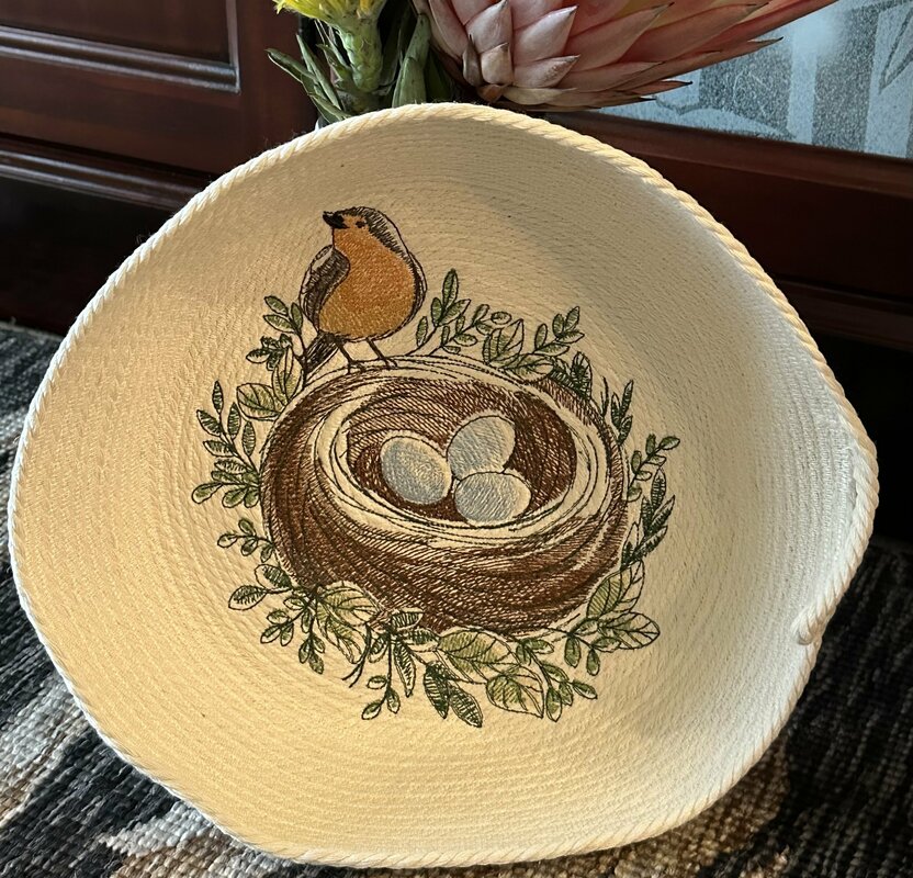 Beautiful hand stitched Blue bird and nest of eggs created in a white cloth basket